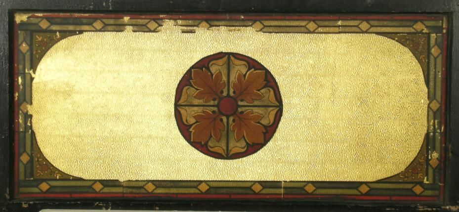 Transfer on rippled amber glass; central oak leaf design; border with diamonds.