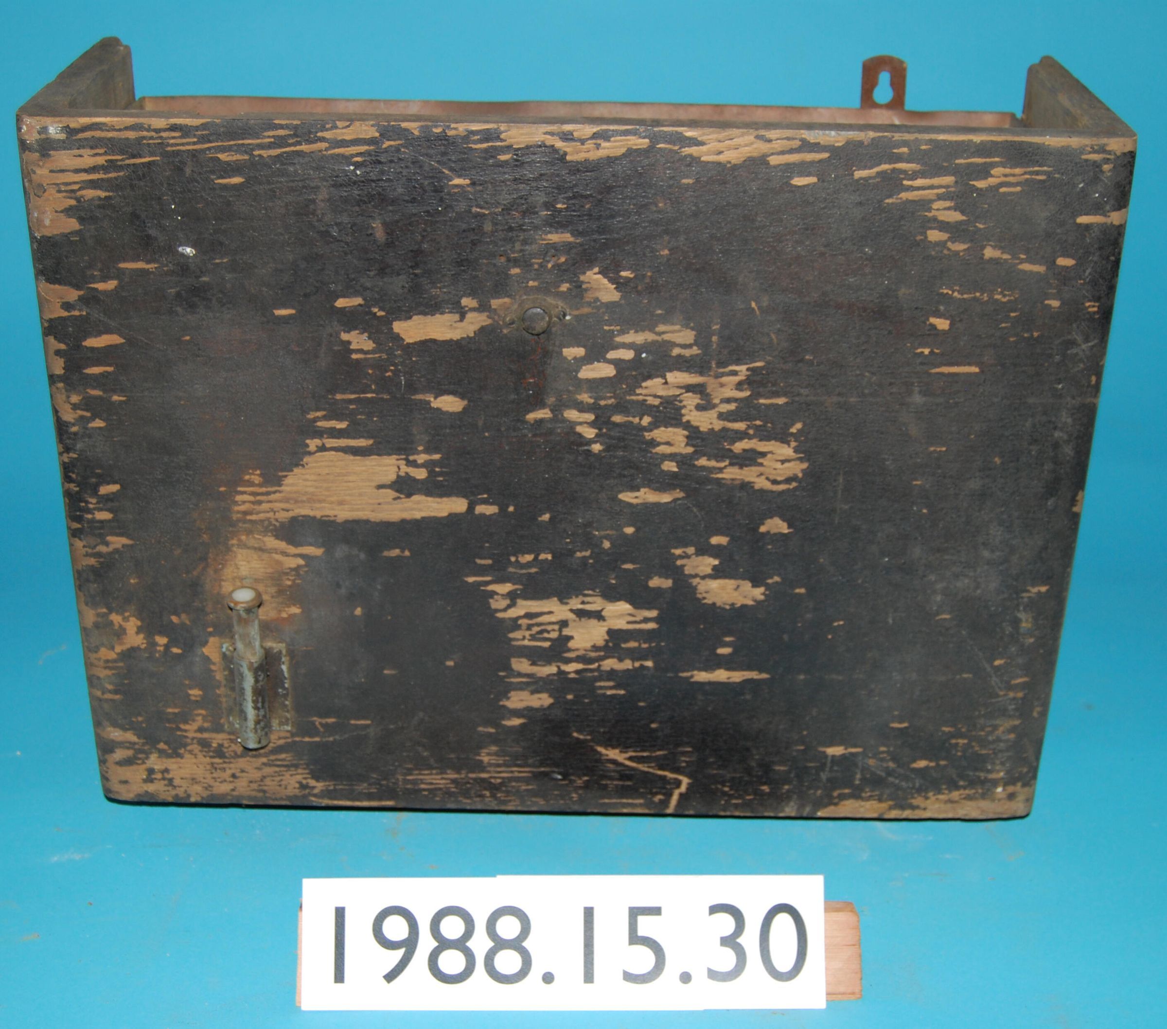 Rectangular. Hardwood. Wall-mounted toilet tank. Complete flushing mechanism with brass ball float. Push-rod flush lever with inlaid Mother of Pearl. Detached elbow fitting. Copper lined tank.