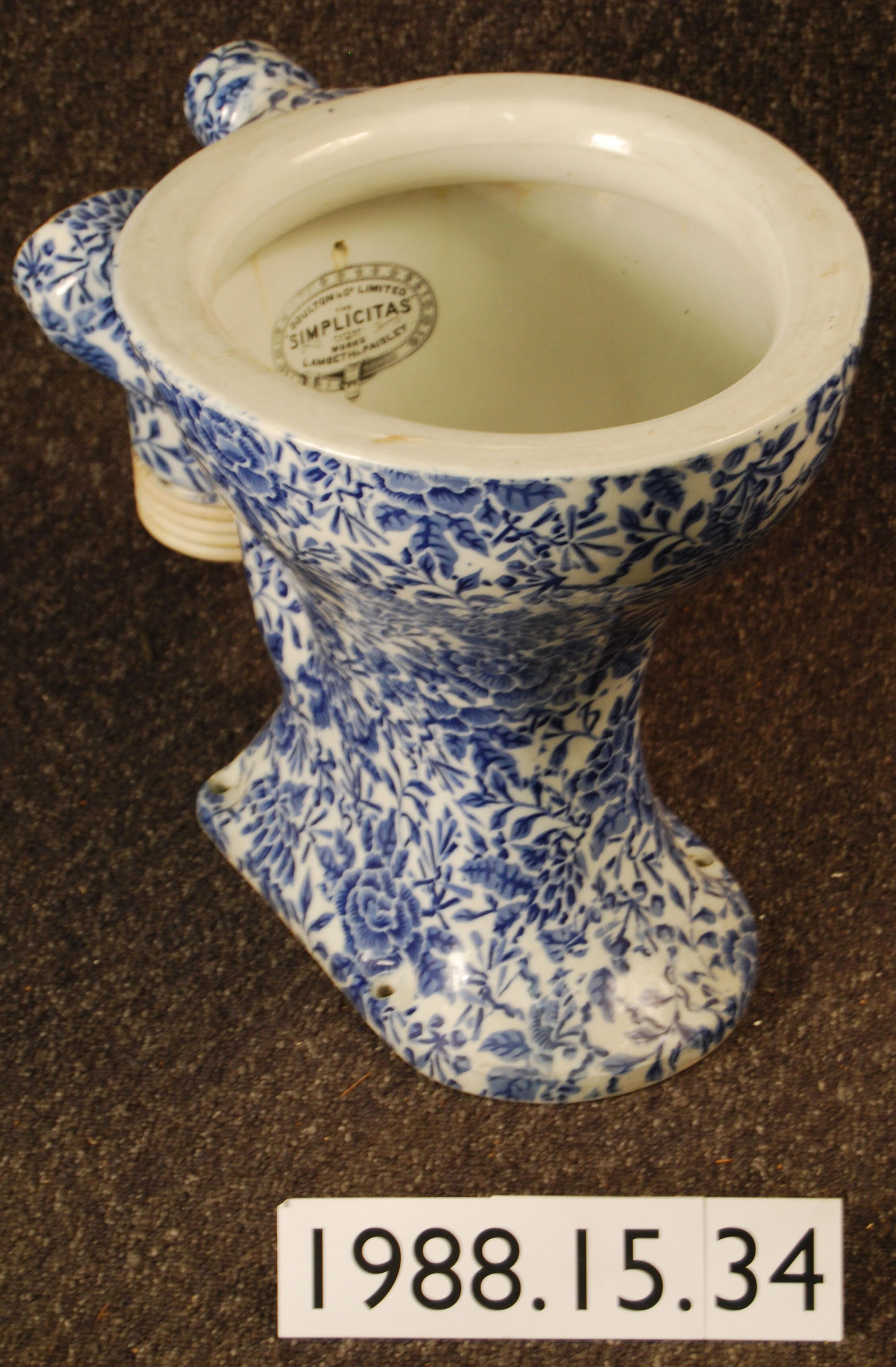 Toilet bowl with blue transfer printed paisley pattern botanical motif on exterior of bowl. Interior of bowl has black transferprinted trademark: "DOULTON & CO LIMITED / "SIMPLICITAS" / PATENT / WORKS / LAMBETH & PAISLEY. " Fabric of bowl appears to be vitreous ceramic.