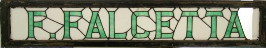 Transom. "F. Falcetta"; White opaque glass; green opalescent glass; one piece missing.
