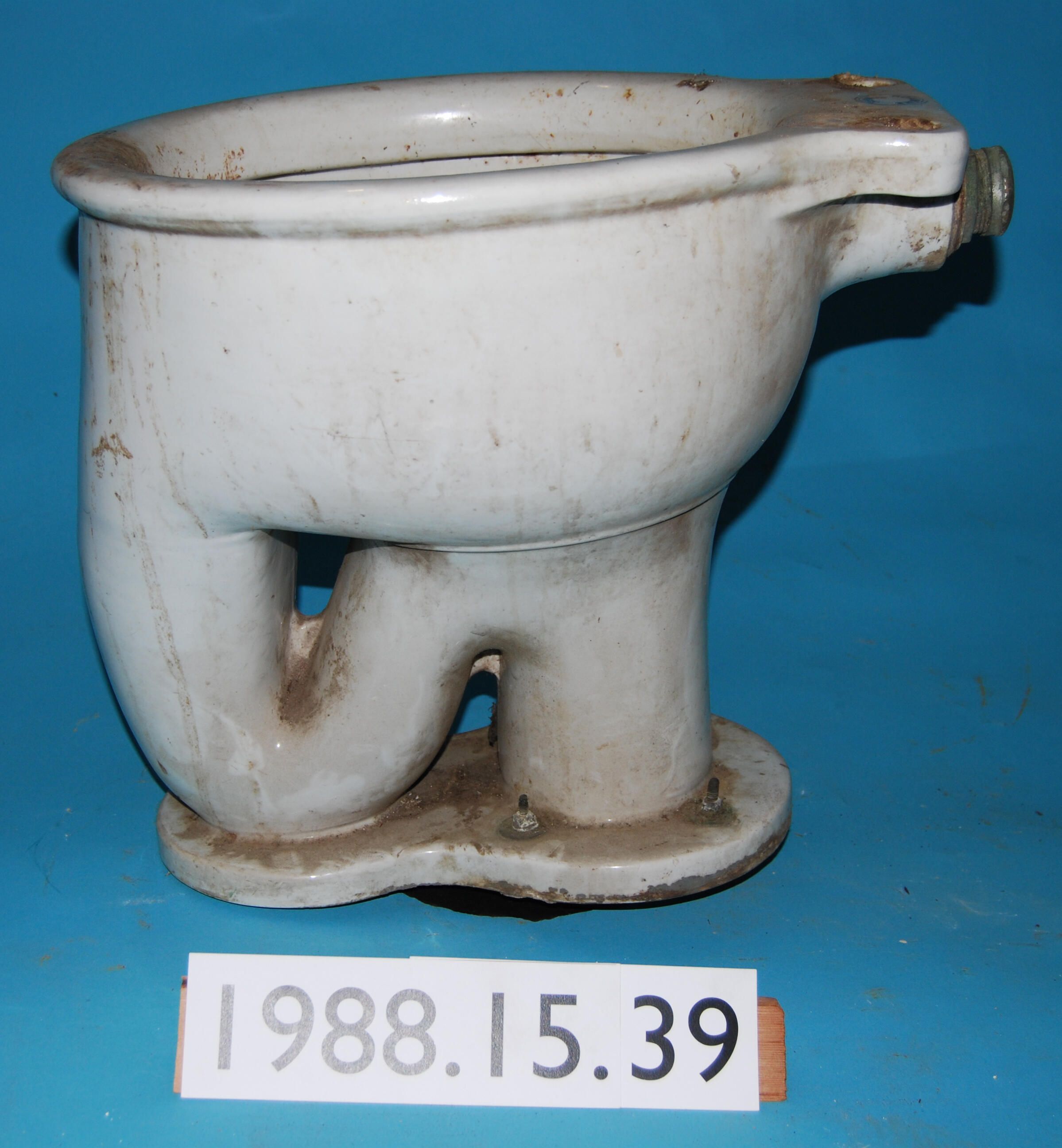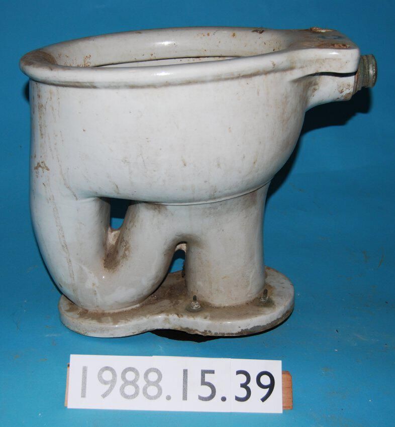 White vitreous china wash down toilet bowl. Black transfer-printed trademark: "Roanokeware." Additional trademark: "Crane Co." Additional trademark: "China / Vitreous / T. P. Co. / 5."