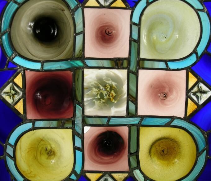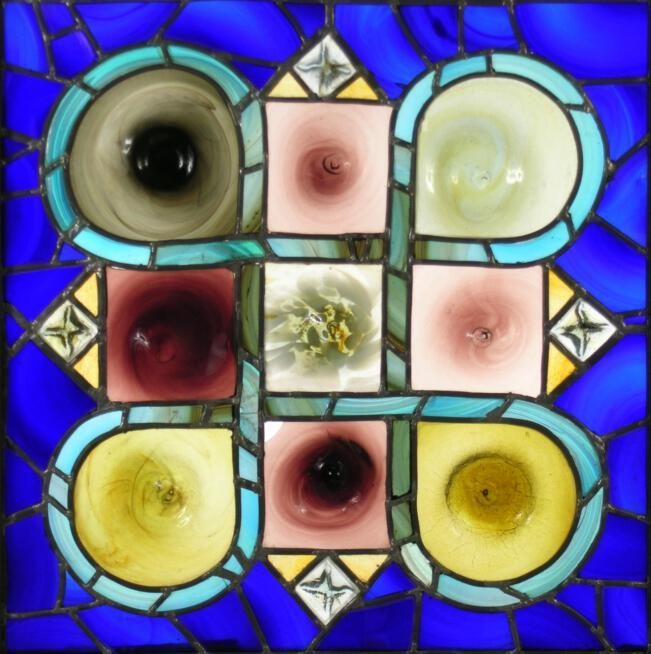 Pressed jewels in NY Hiatt Glass. Iron molds bought at Leo Popper's. Hand blown rondels (9) in geometric design.