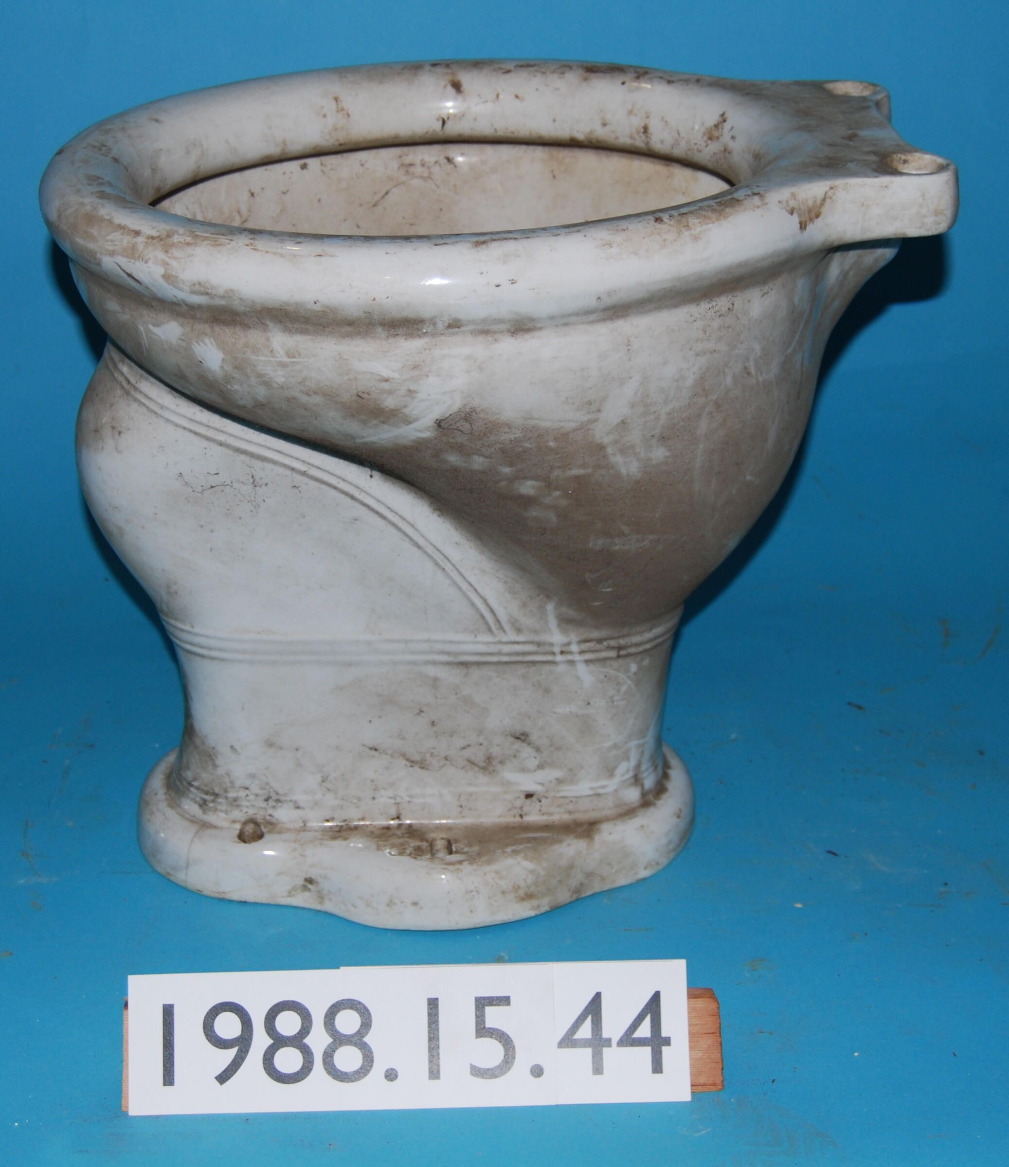 White, vitreous ceramic toilet bowl. Trap masked with smooth finish. Decorative ribboning on bowl and base. Bolt-on seat missing. Inscriptions or Markings: Manufacturer: Place of Manufacture: Design motif: Style: Finish: Glazed
