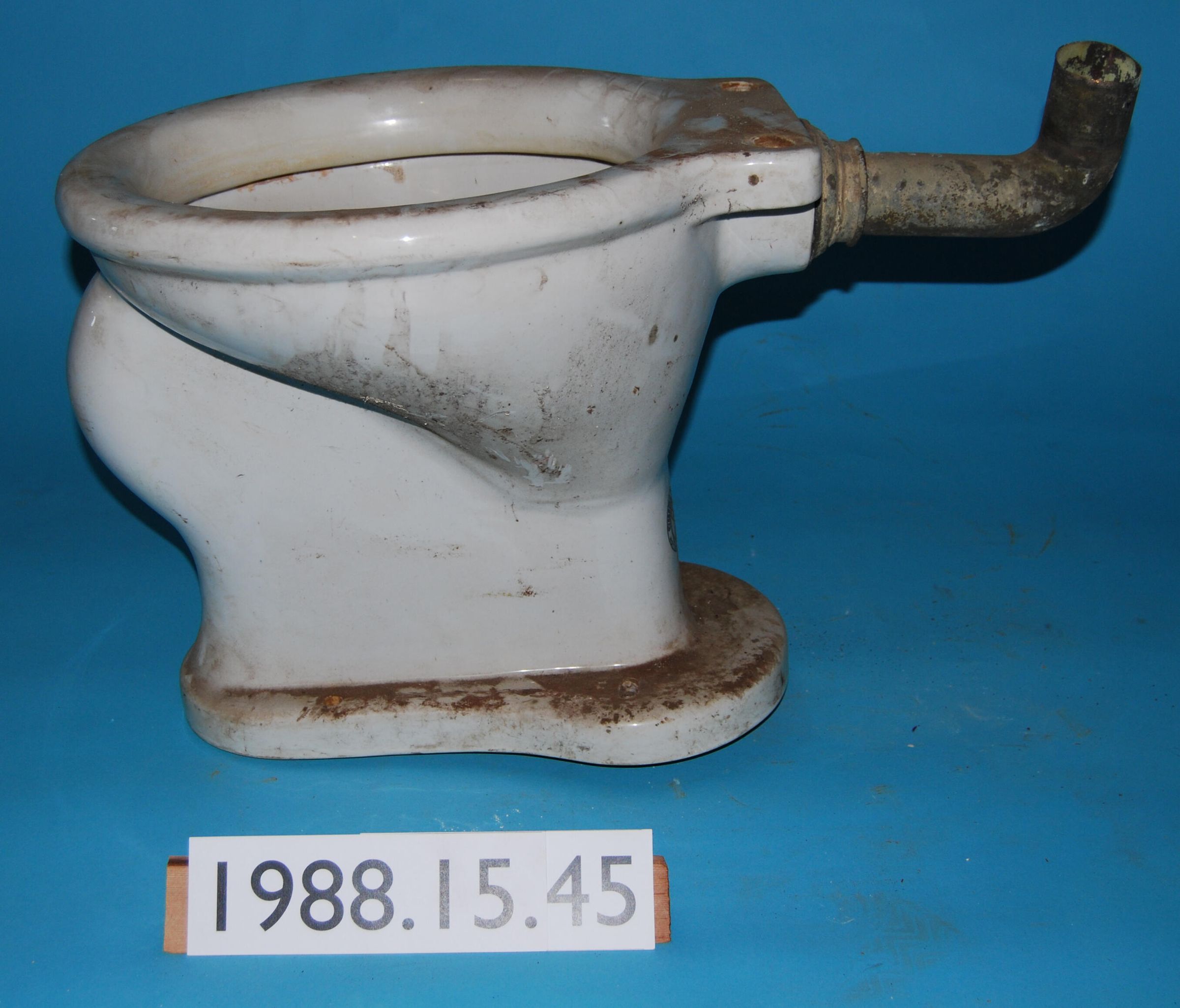 White, vitreous china toilet bowl. Trap masked by smooth finish. Bolt-on seat missing. Black transfer-printed trademark: "China Vitreous / Impervio / T. P. Co. / Trenton Potteries Company / * 1." Attached elbow piece.