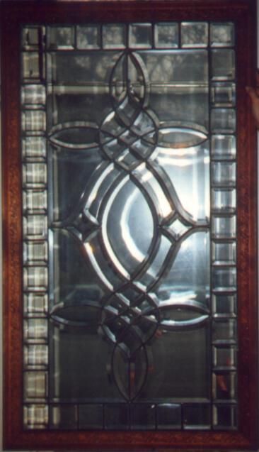 Beveled Glass; Geometric design surrounded by square beveled border. In Pressed wood picture frame.