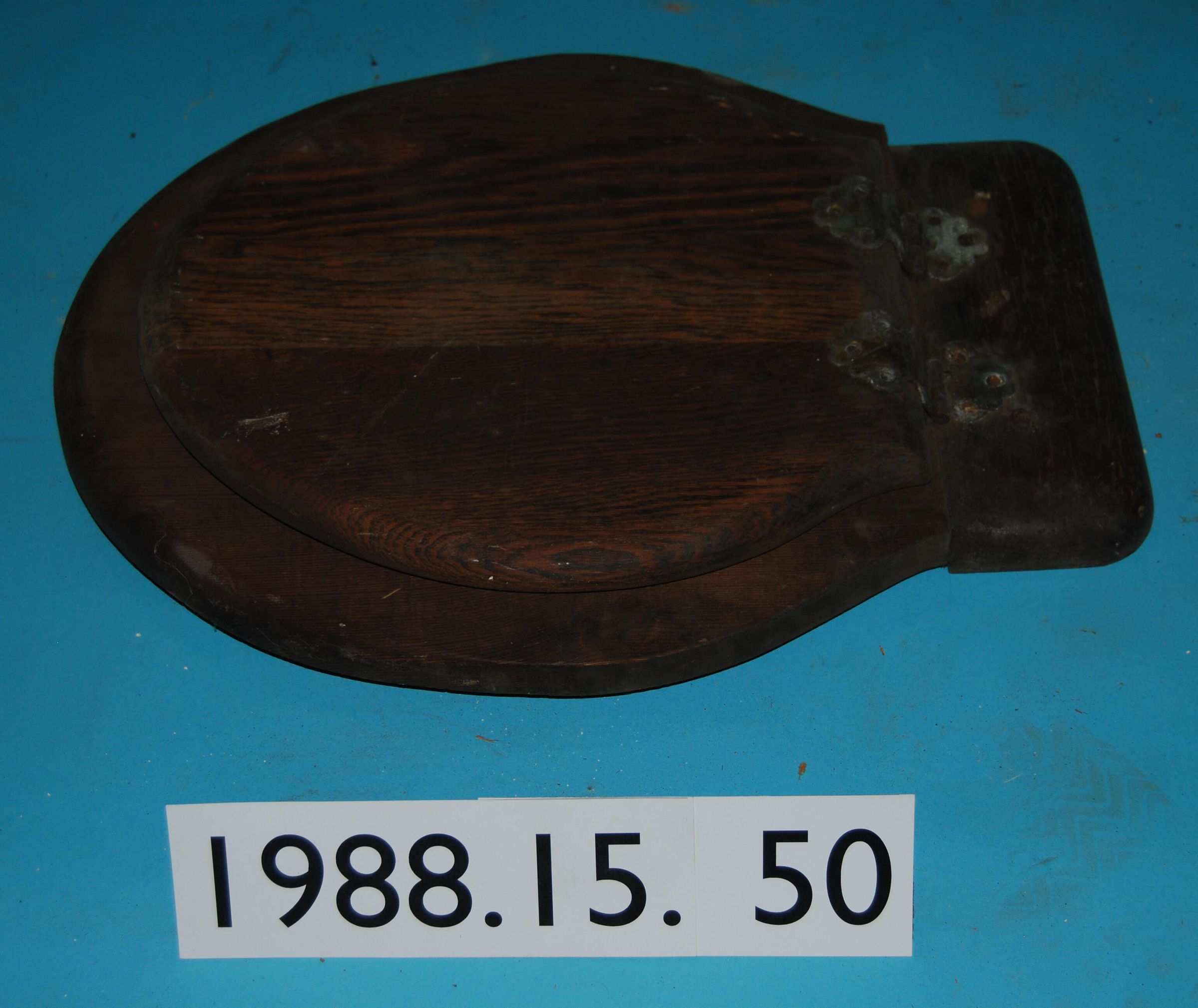 Hardwood. Toilet-mounted toilet seat and lid. Cedar seat added post-original construction. Two pieces joined at center with cleats. Oak lid with fixed joint hinges on both. Ovoid-shape.
