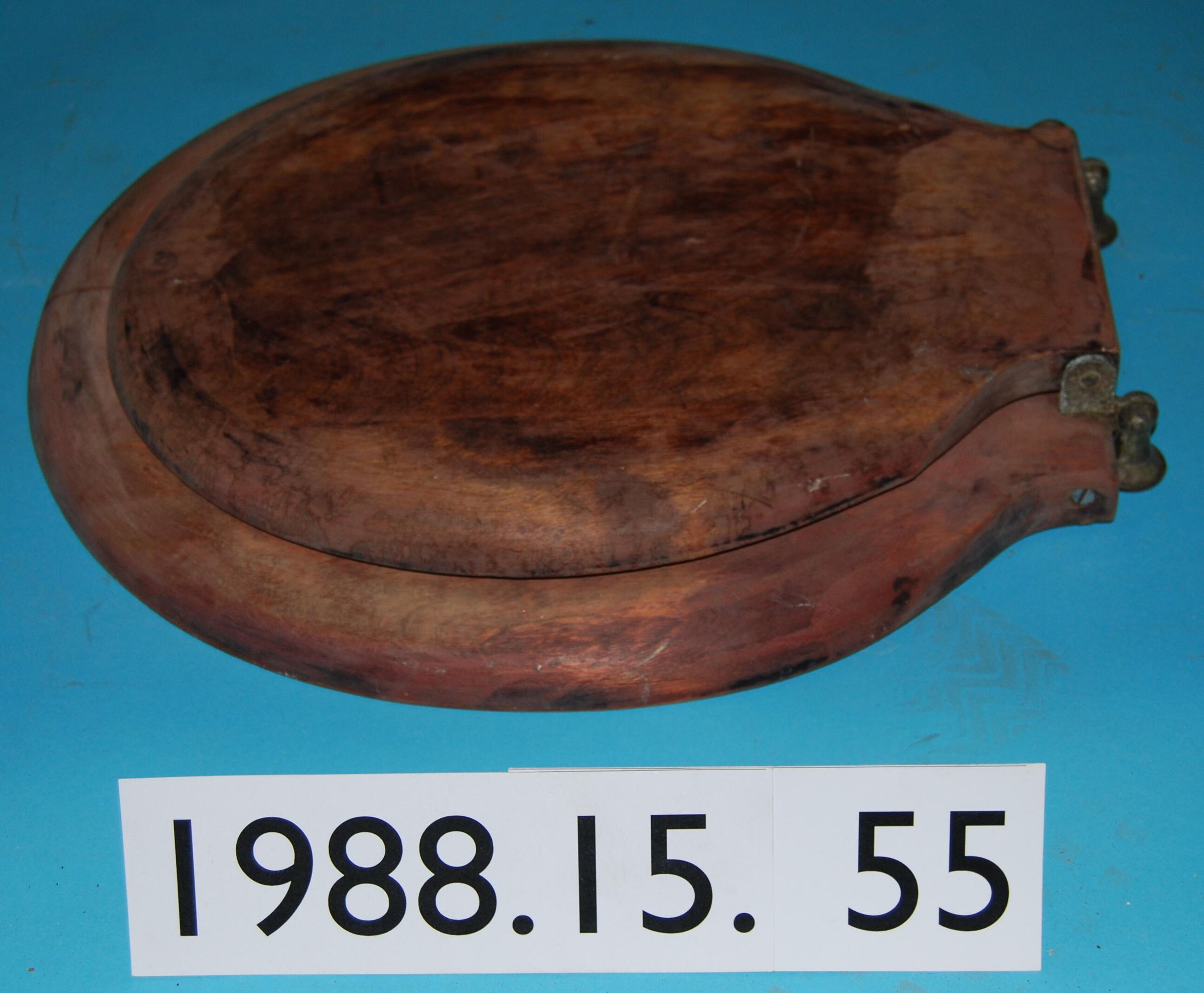 Hardwood. Toilet-mounted seat and lid. Seat and lid constructed with tongue and groove joinery. Plate an shank pivoting hinges. Original finish stripped.