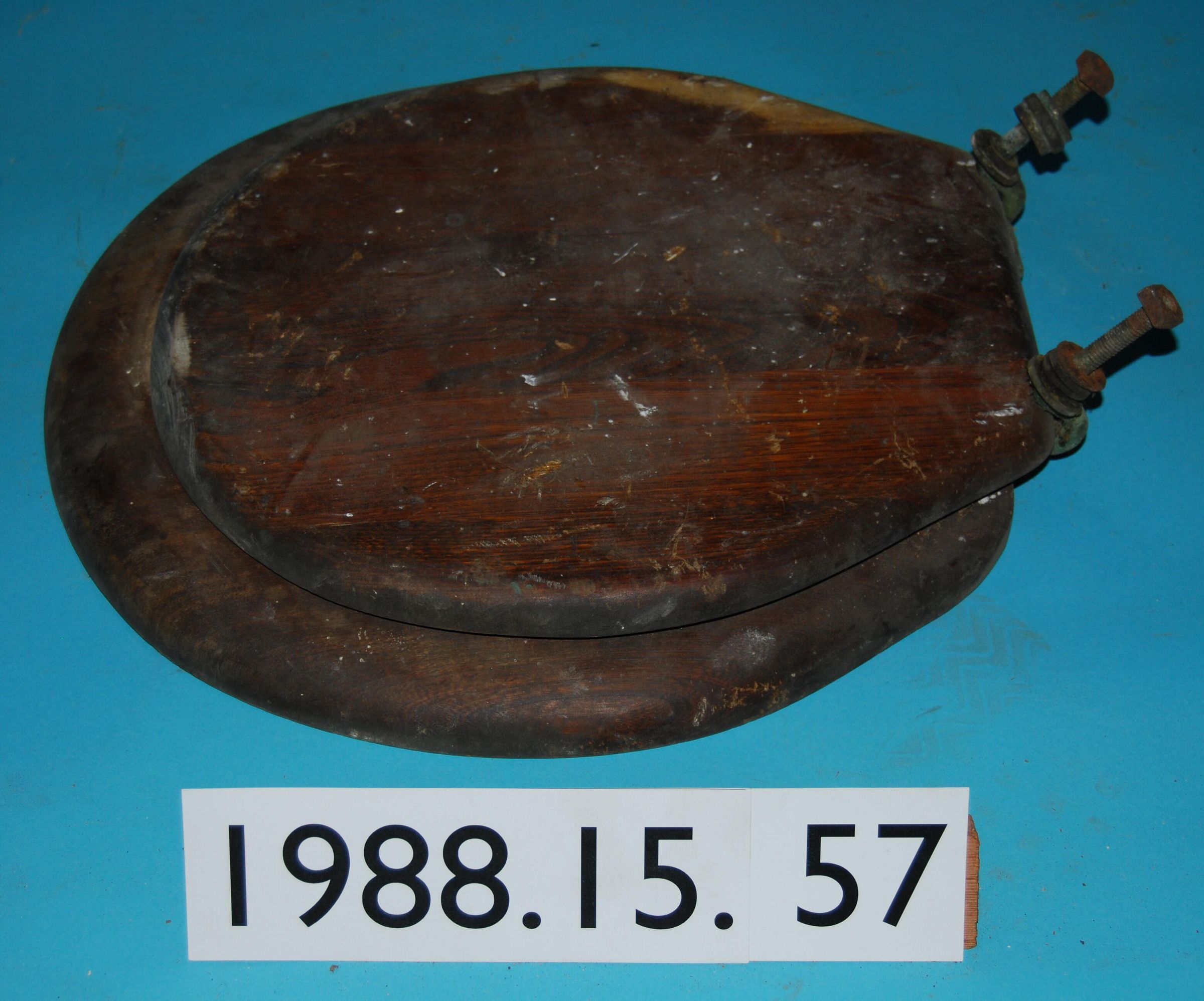 Hardwood. Toilet-mounted seat and lid with tongue and groove joinery. Brass a-shaped hinge with threaded rod and attached straps. Inscriptions or Markings: Manufacturer: Place of Manufacture: Design motif: Style: Finish: Original Varnish
