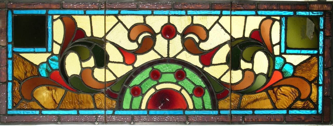 Material: Flashed glass (red); Hand rippled glass (gold, lavender, blue, green); faceted jewels spiral half-moon.Lexicon