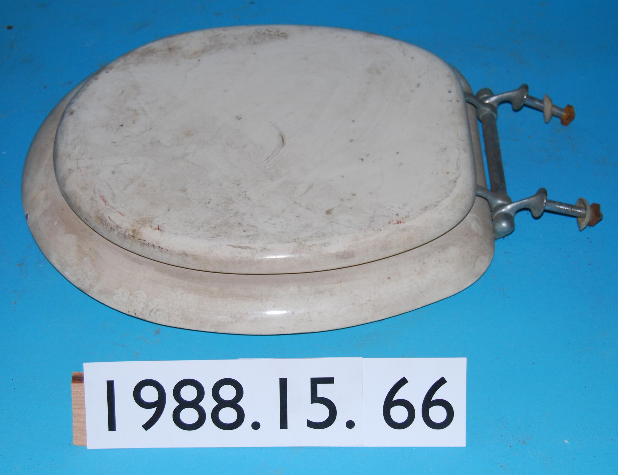 Wood seat and lid with original white enamel finish. Inscriptions or Markings: Manufacturer: Place of Manufacture: Design motif: Style: Finish: White Enamel