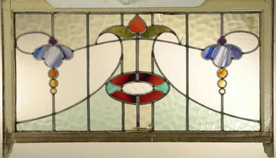 Flemish glass; blown cathedral glass; Art Nouveau; Floral and insect design. Includes latch.Lexicon