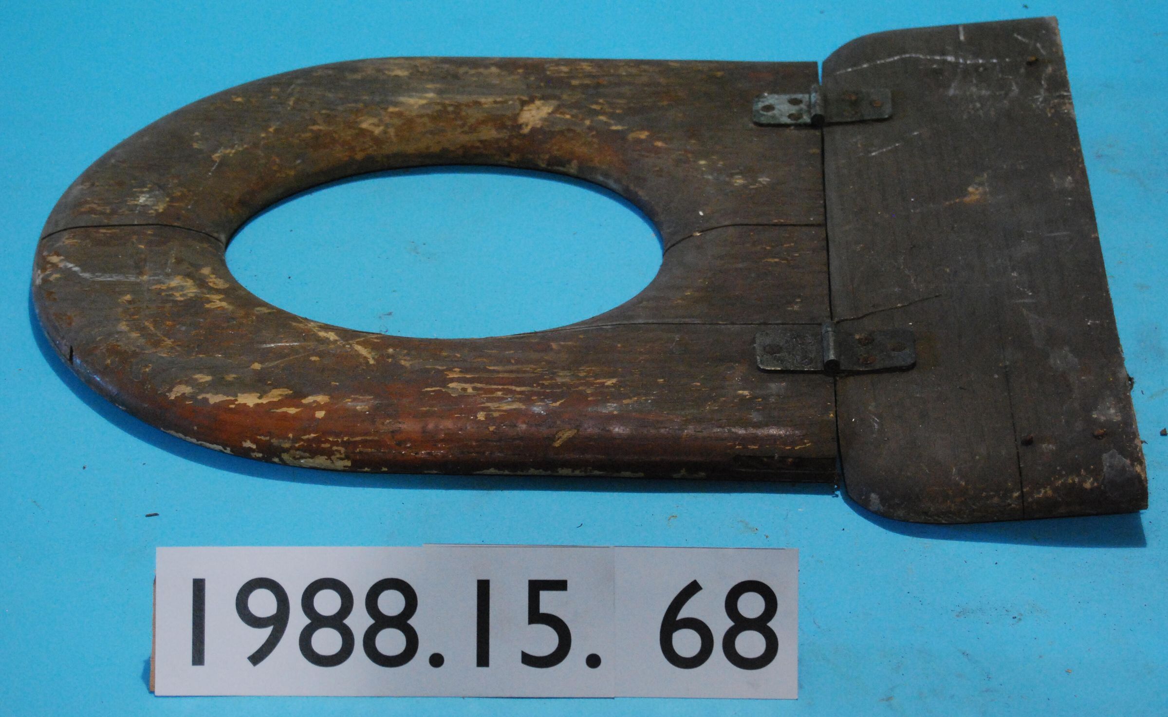 Wall-mount. Hardwood. Seat only. Brass-fixed-joint hinges. Remnants of varnish. Inscriptions or Markings: Manufacturer: Place of Manufacture: Design motif: Style: Finish: Remnants of Original Varnish