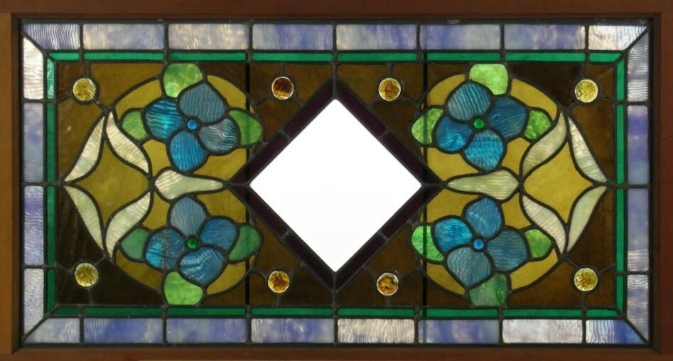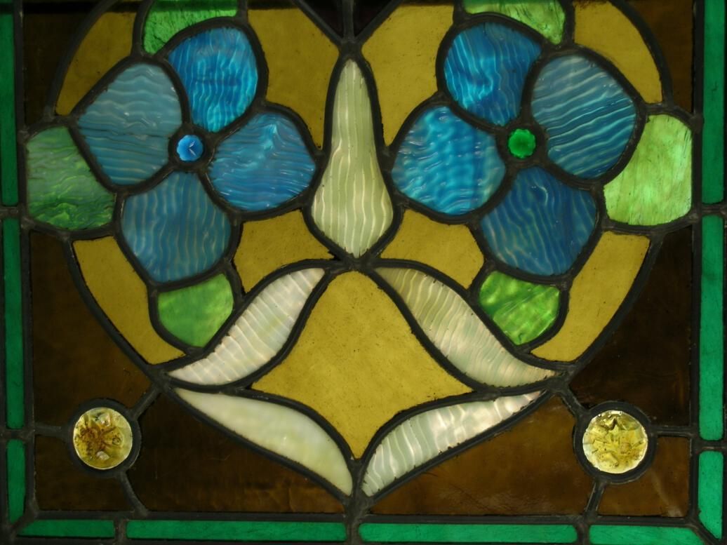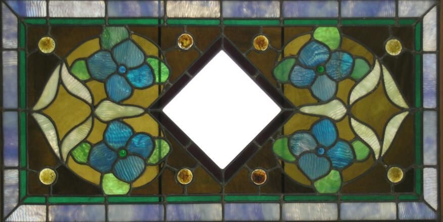 "Povey" style. Blue dogwoods; cast amber jewels; central beveled diamond with red border; border in hand-rolled opalescent blue around green border; reinforcing bar.