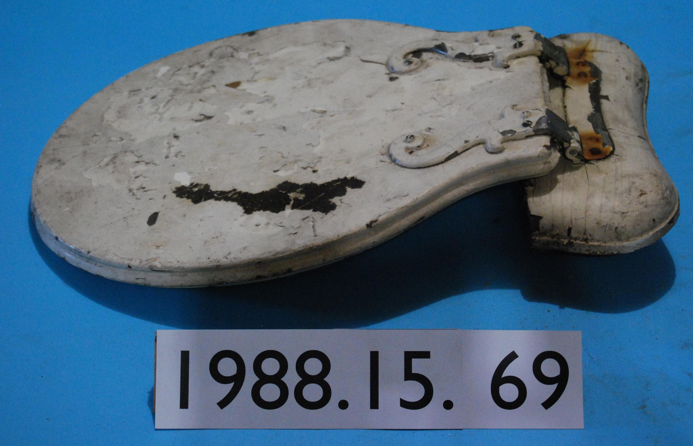 Wall-mount. Hardwood. Oval lid. Brass hinges with scroll motif. Seat missing. Originally varnished - now painted white.
