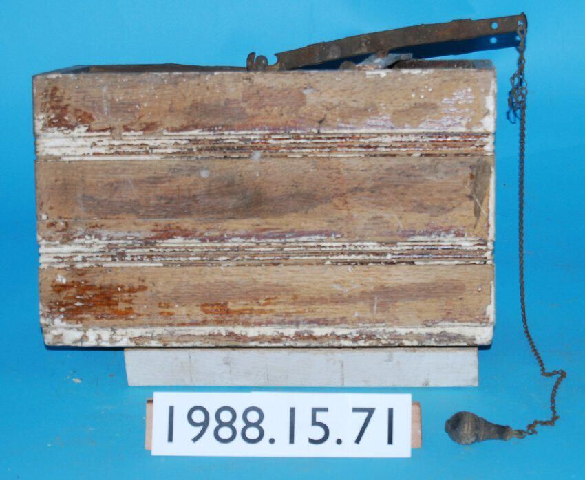 Rectangular. Hardwood. Wall-mounted toilet tank. Cast iron flush valve and lever with attached chain and wood pull. Copper lined tank. Originally varnished -- now with remnants of white paint. Wood boring insect damage on back boards (inactive).