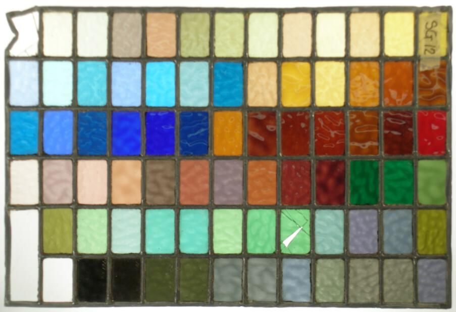 Leaded panel of sample glass. Muffled glass colors; 1.5 X 2" rectangles.