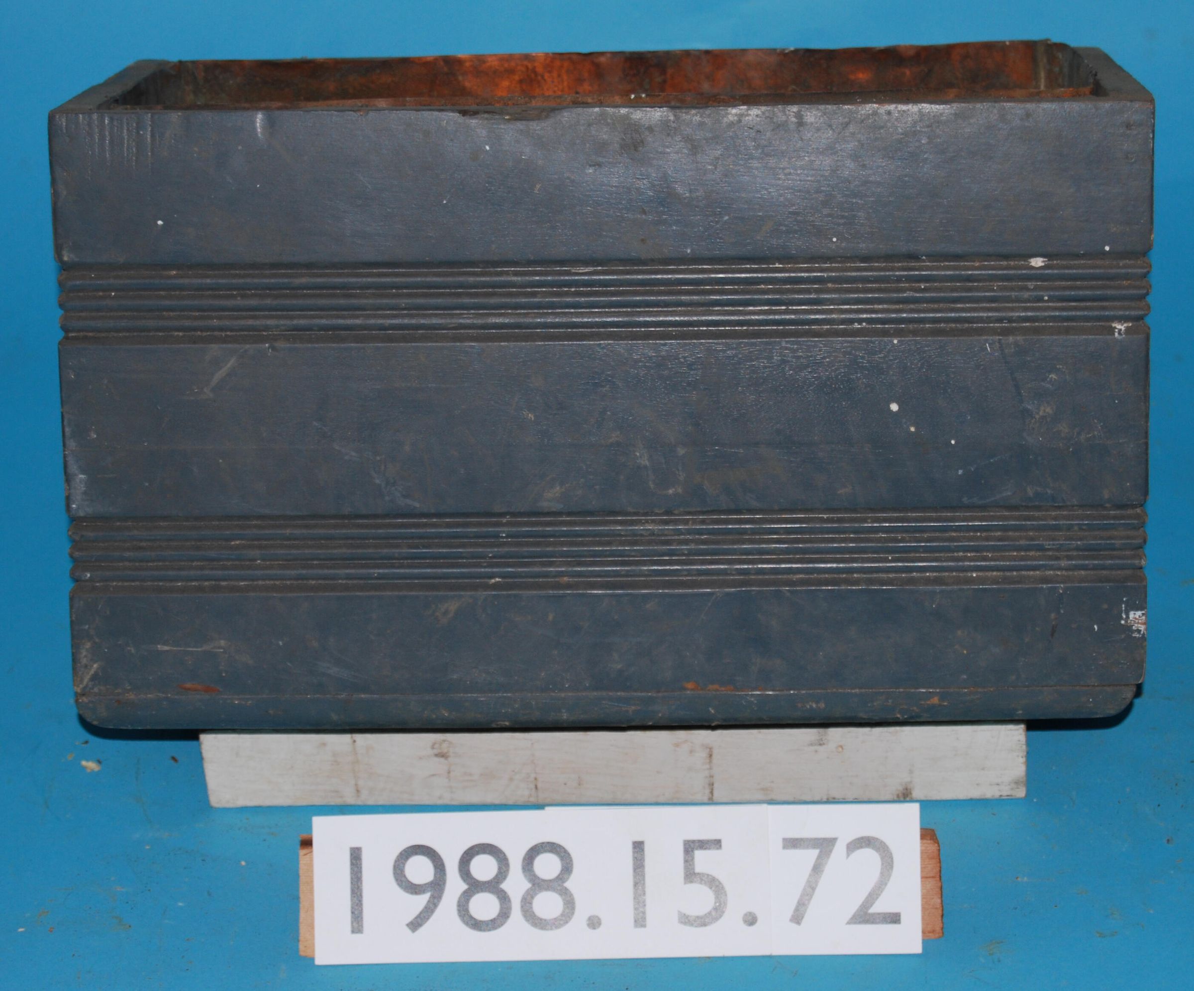 Rectangular. Hardwood case. Wall-mounted toilet tank. Flush valve mechanism is missing. Copper lined tank. Originally varnished -- tank case now painted gray.