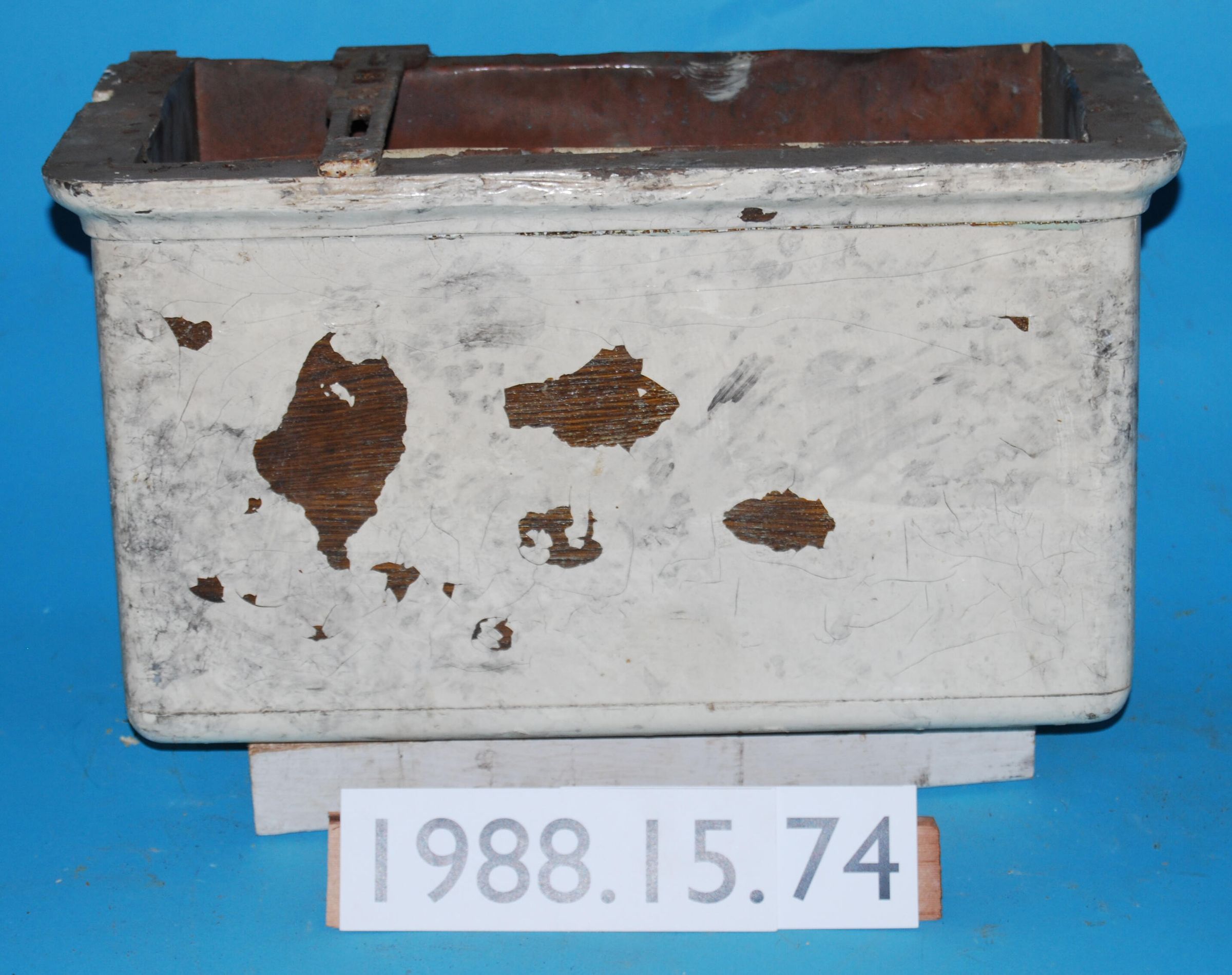 Rectangular. Hardwood case. Wall-mounted toilet tank. Copper lined tank. Brass valve and brass float with iron arm. Flushing lever and mechanism missing. (2) mounting boards. Detached. Original finish varnish - now painted white.