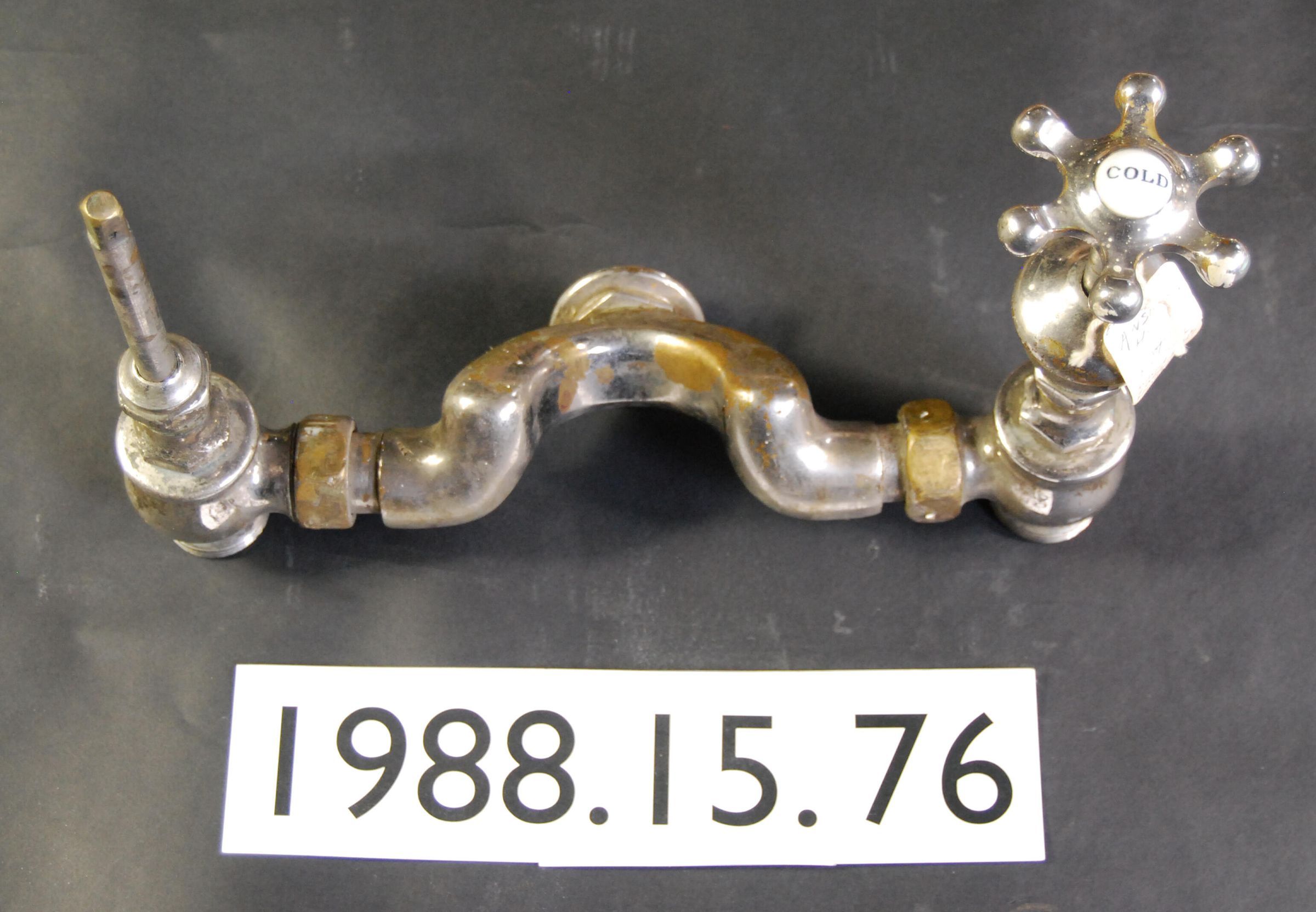 Dual nickel-plated brass bathtub faucet water handle with vitreous ceramic insert "COLD." HOT handle missing. Inscription on tag with provenance: Ainsworth House. Originally designed by Issac Hodgson Jr. Tag inscription: "Gift 1986"