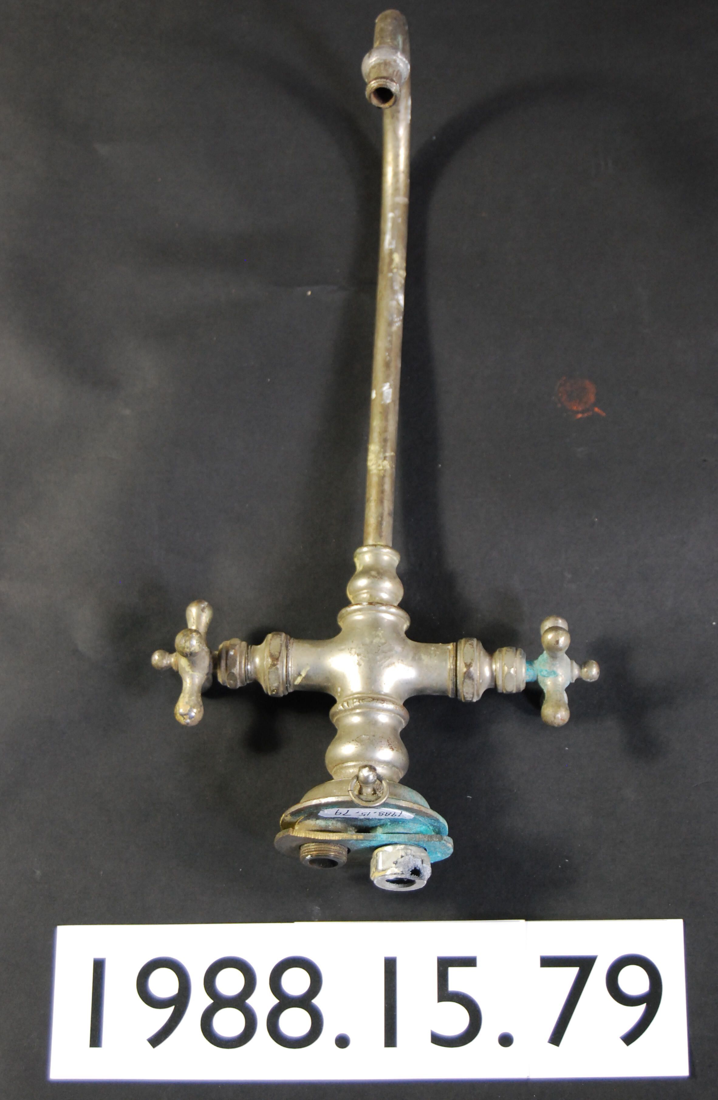 Dual nickel-plated brass pantry faucet. Dual. Four arm handles with goose neck spout.