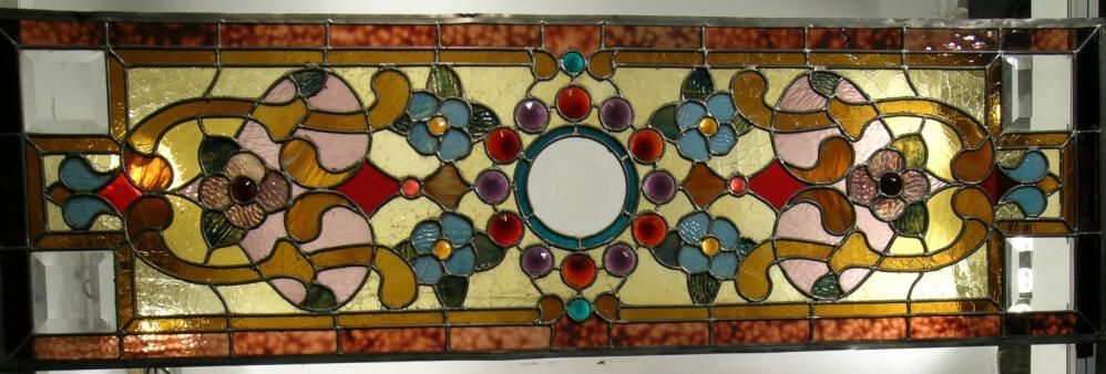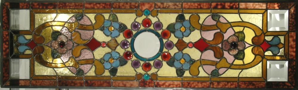 Material: Purple Genesis Cat's Paw glass border; spectrum opalescent glass; paisley figures; rippled opalesent 4-petal design (blue and purple); Genesis turquoise; red flashed glass; purple English (old); muffled glass; clear beveled glass.Lexicon