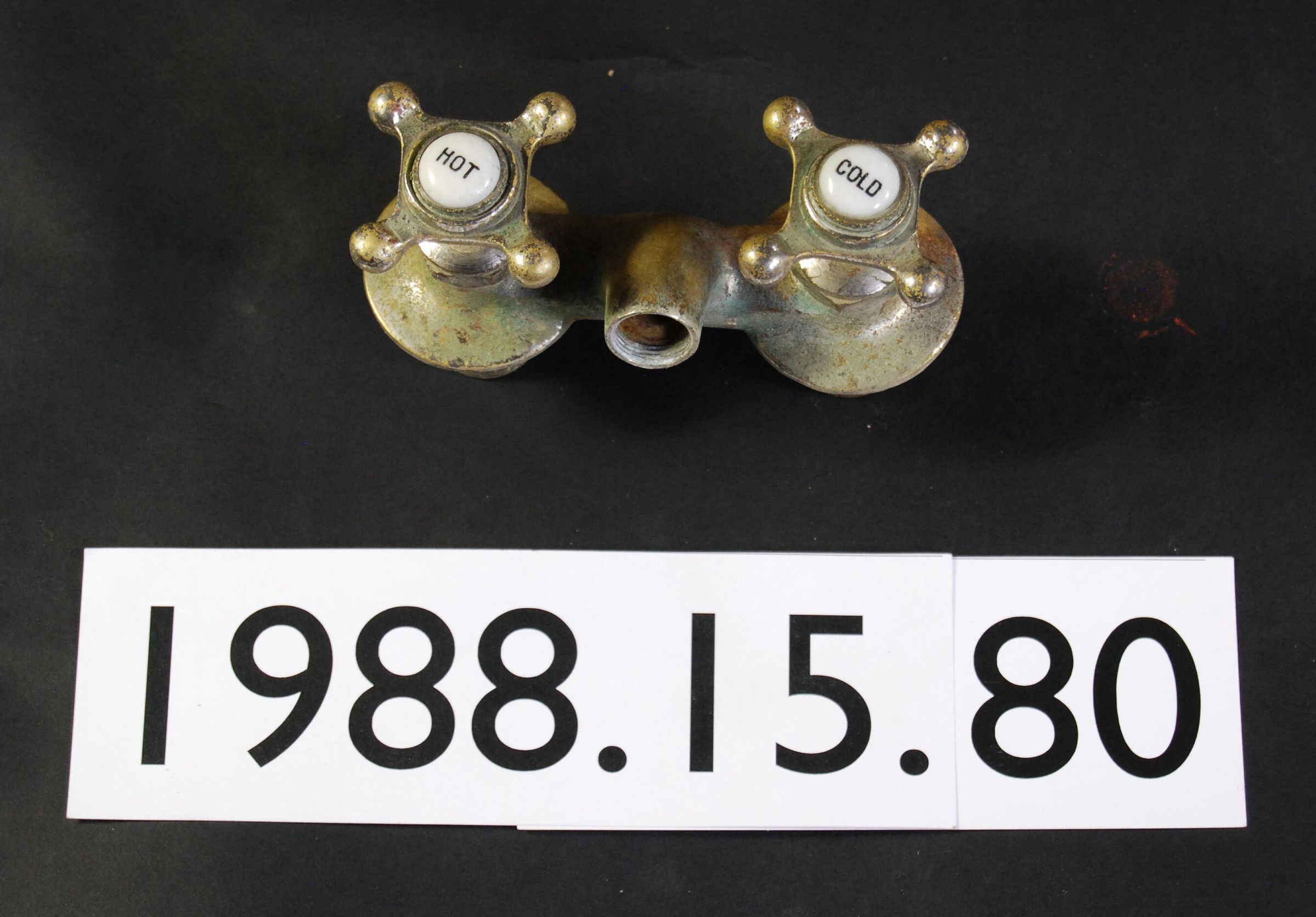 Dual nickel-plated brass sink faucet. Dual. Four arm handles with vitreous ceramic inserts for "HOT" AND "COLD." Single spout. Vertical mount..