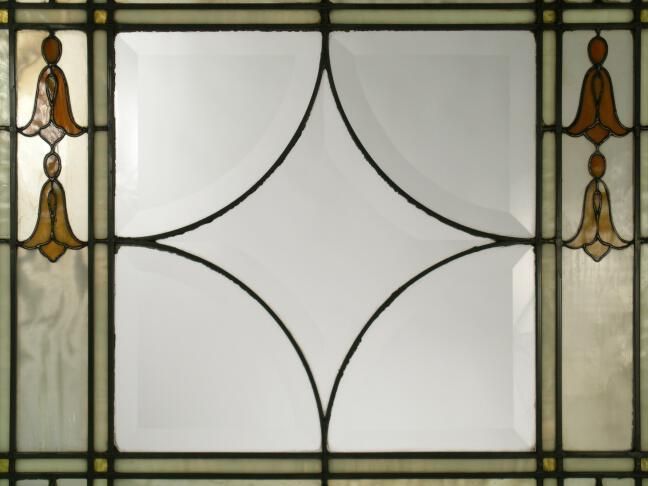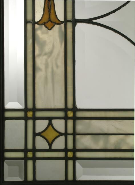 Beveled geometric diamond center and border; central bevel motif; opalescent gold flowers; mottled glass border; opalescent white border; granite texture glass inserts in flowers and at border corners; zinc in different sizes.