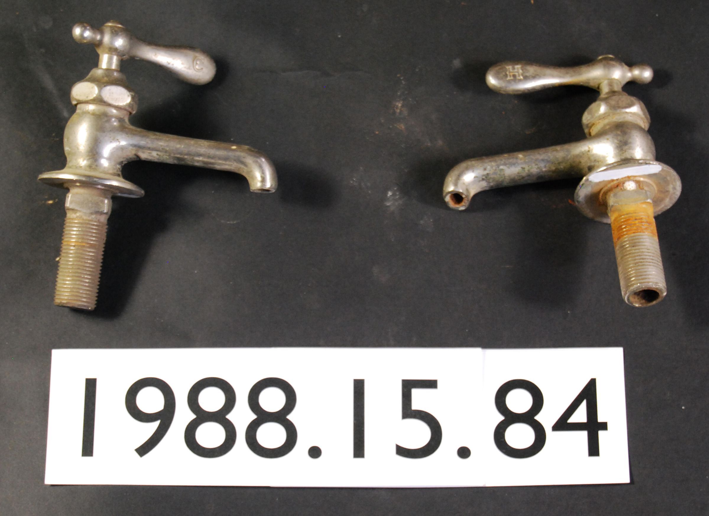 Pair of nickel-plated brass sink faucets with tee handles. Handles have "H" and "C". Each with single spout. Horizontally mounted. Impressed mark on each.