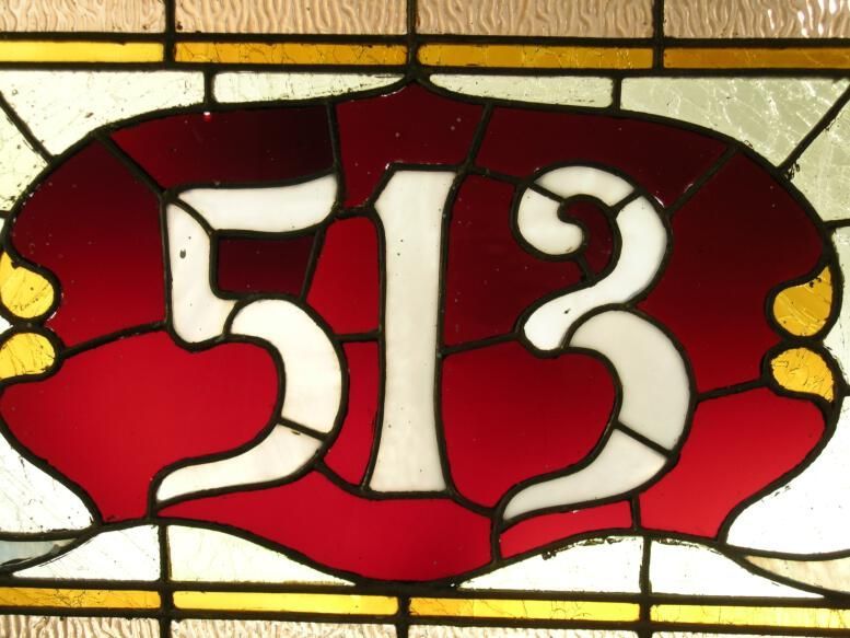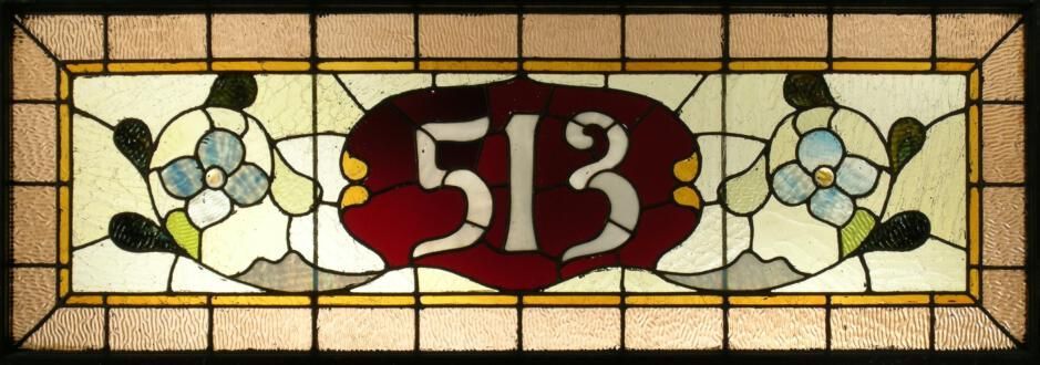 Transom. Address number on red shield (flashed glass); gold crackle glass; mauve rippled border; crackle border; turquoise rippled glass dogwood flowers; bulls eye opalescent jewels; lead painted (to look like brass); Victorian style.