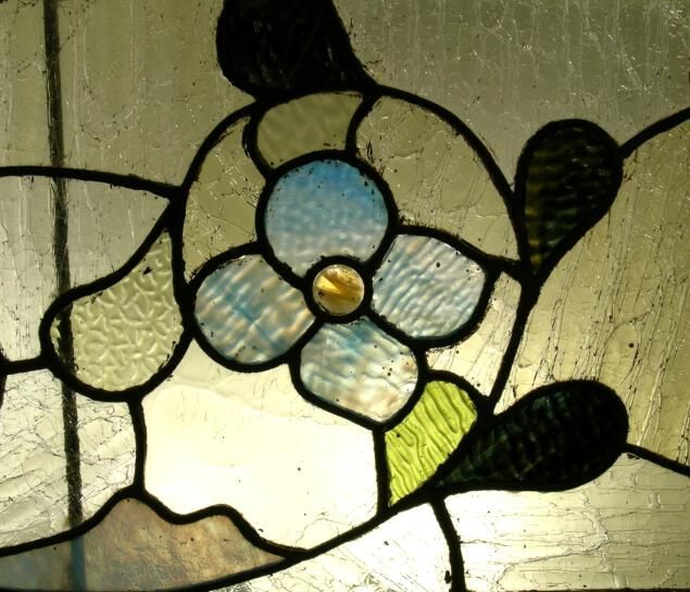 Material: Gold crackle glass; blue rippled 4-petal dogwood flower. Cedar sash.Lexicon