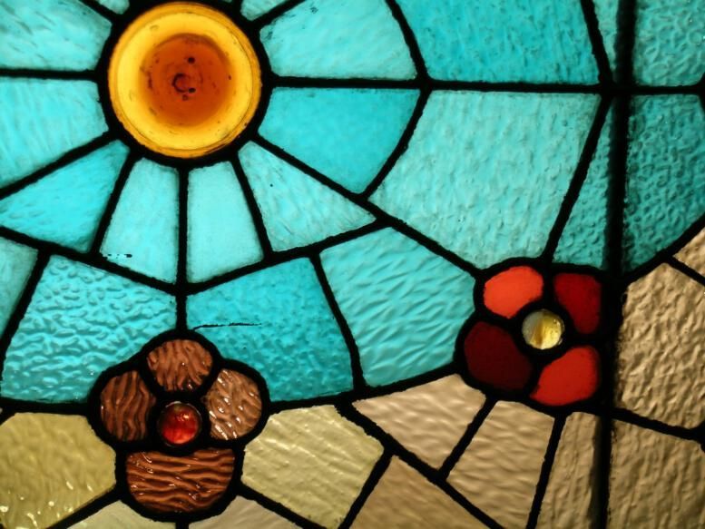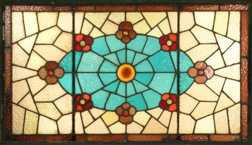 Leaded; Muffled glass; red flashed glass; 4-petal dogwood flower pattern w red flashed glass and rippled glass. bulls eye opalescent jewels; rondel in center. Mosaic background ( turquoise center / gold background). Muffled glass in border and entire center.