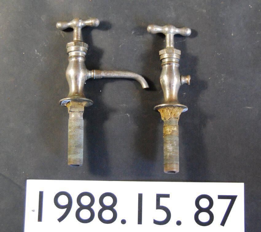 Pair of nickel-plated brass sink faucets with nickel-plated brass handle. Single thin spout. One spout is missing. Impressed maker's mark: "McN & H. MFG. Co. N.Y." Horizontal mount.