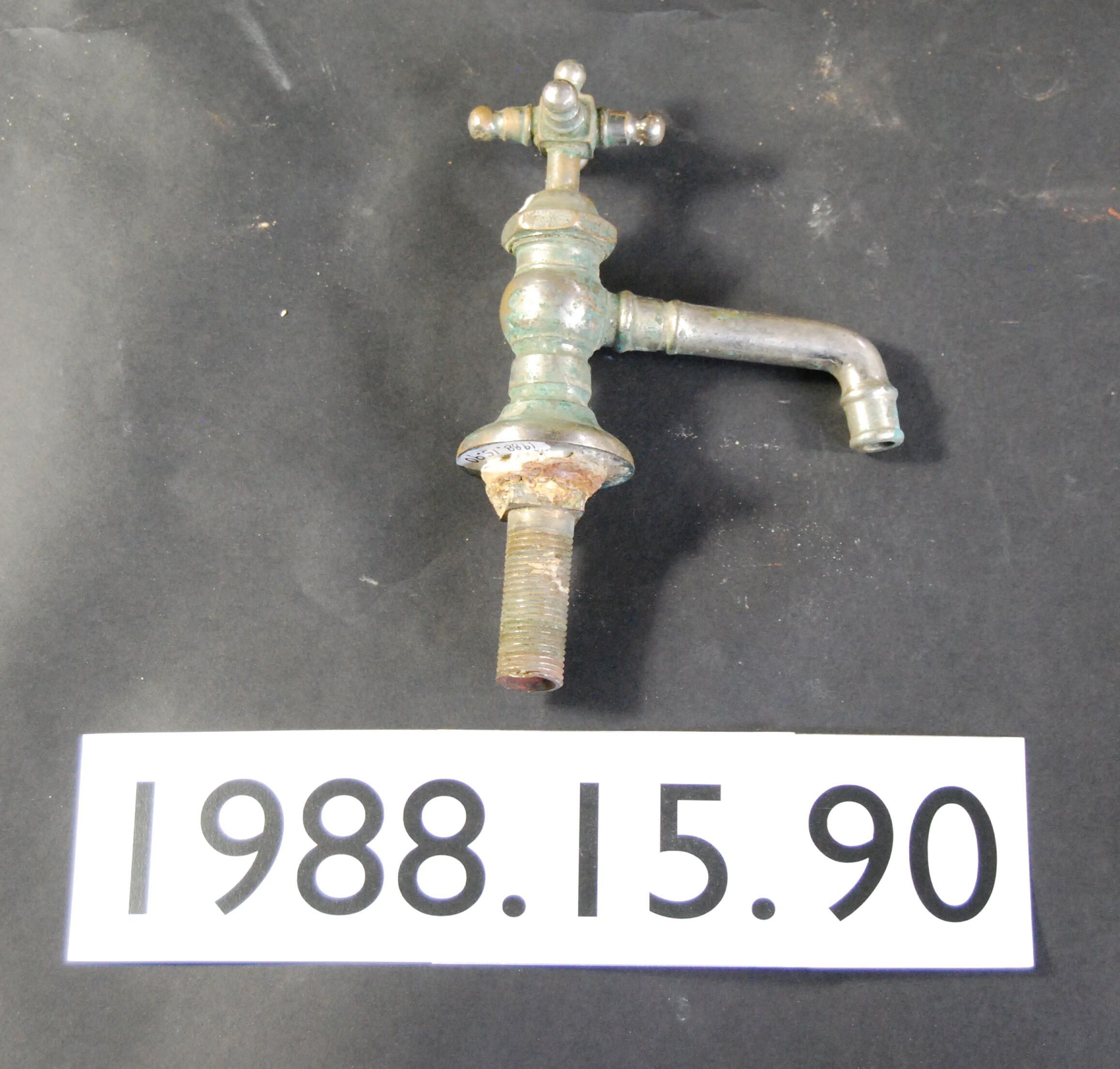 Single nickel-plated brass sink faucet with single four-arm handle and single spout. Horizontal mount.