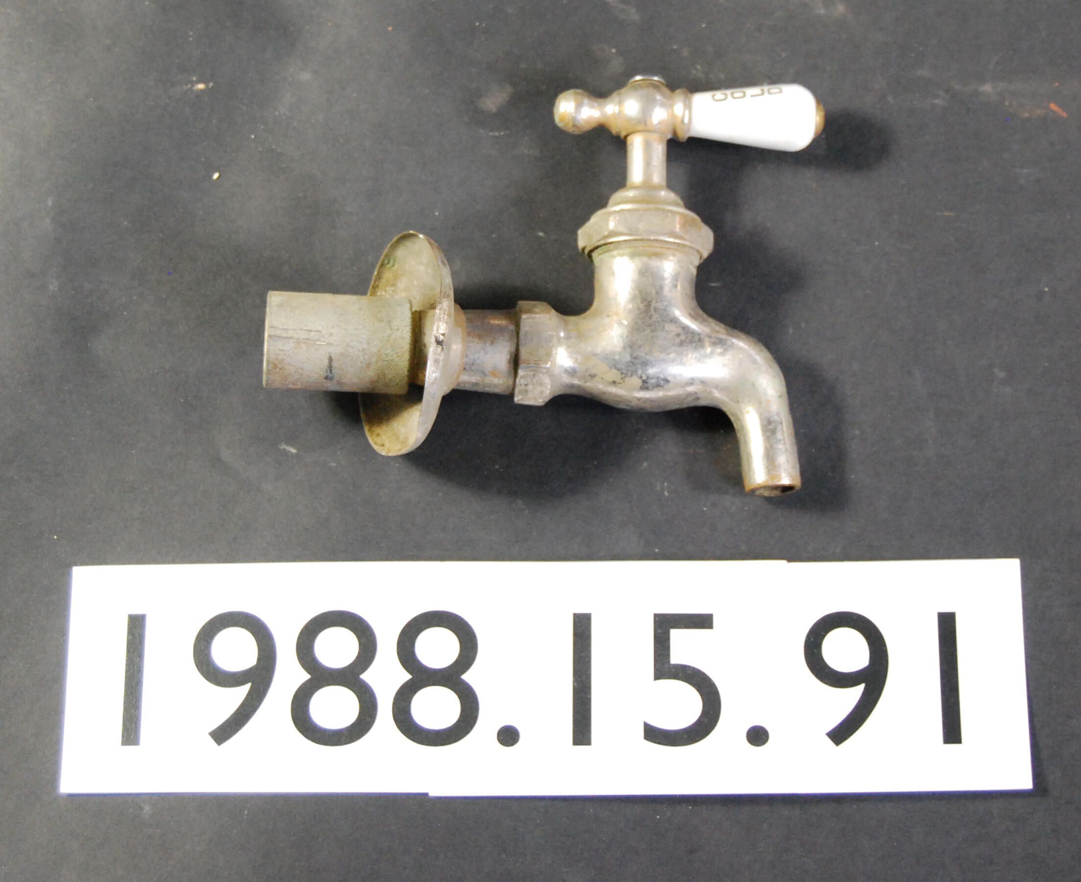 Single nickel-plated brass sink faucet with single tee handle made of vitreous ceramic. Marked "COLD," and single spout. Vertical mount.