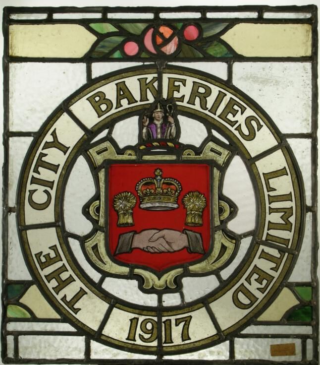 Shield in circle; shaking hands (painted); crown; bishop; mackintosh rose.