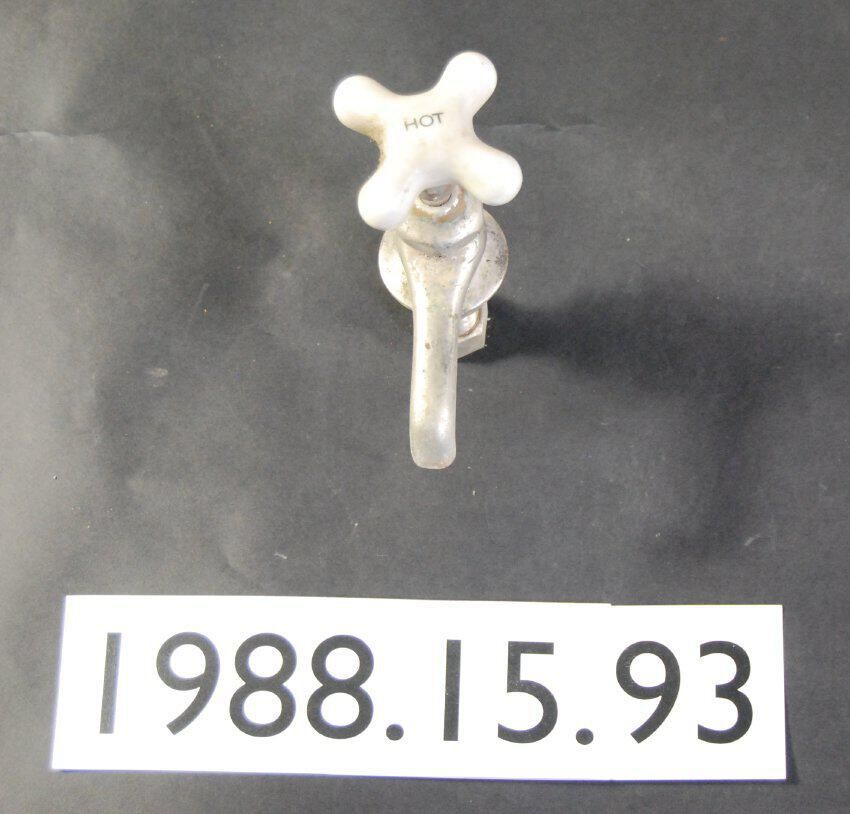 Single. Nickel-plated brass sink faucet with single four-arm handle with vitreous ceramic button. Marked "HOT" and .single spout impressed mark: "Price-Phister. Horizontal mount.