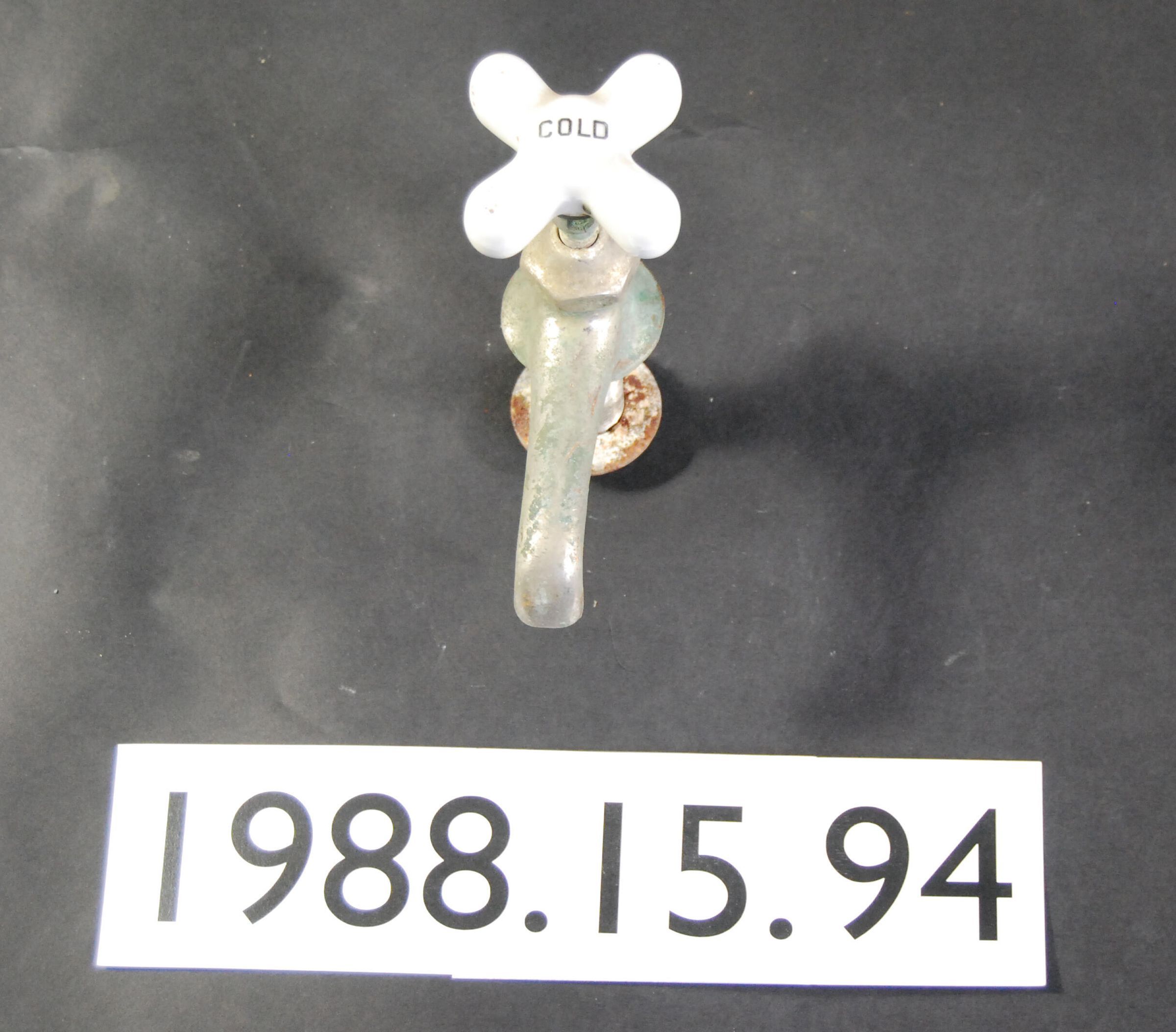 Single. Nickel-plated brass sink faucet with single vitreous ceramic, four-arm handle marked "COLD". Single spout. Impressed mark: "STERLING." Horizontal mount.