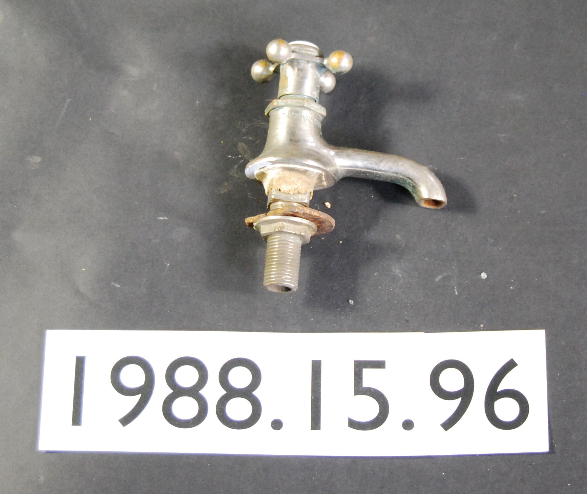 Single. Nickel-plated brass sink faucet with single, spring loaded, four-arm handle with vitreous ceramic button marked "COLD." Single spout. Horizontal mount. Impressed mark: "THE ROYAL BRASS MFG. CO. CLEV'D. O." Possibly from commercial bath sink.