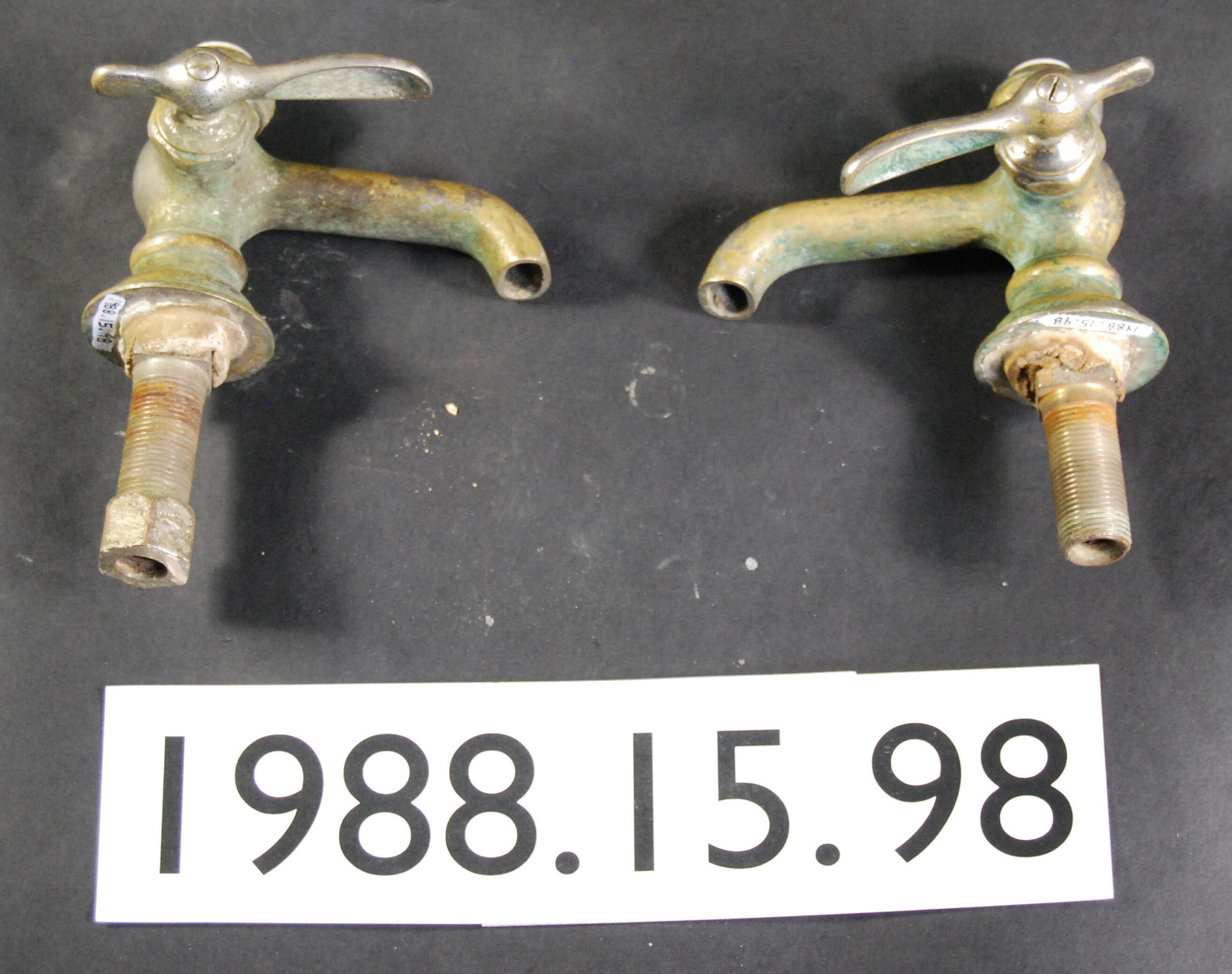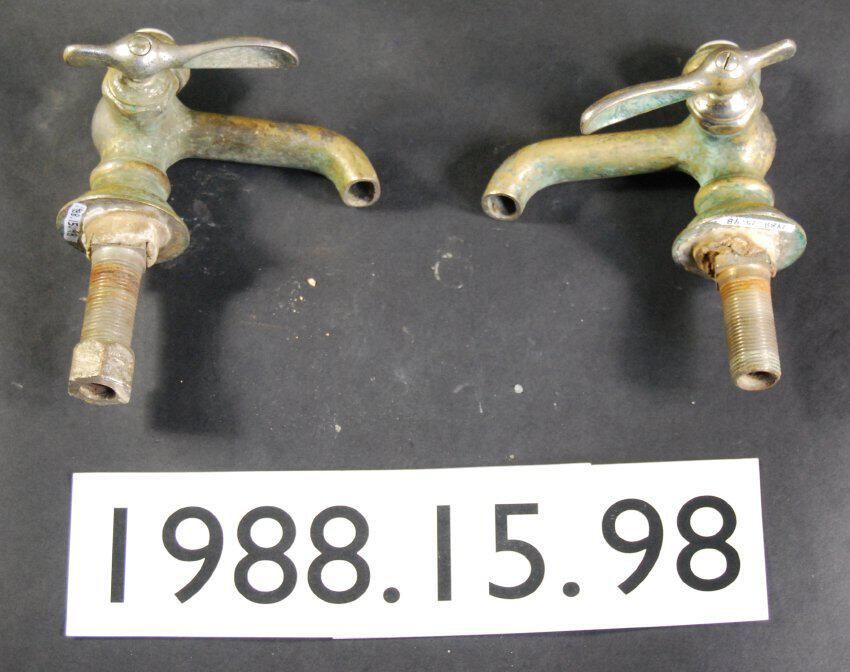 Pair of nickel-plated brass sink faucets with single, side-mounted, spring loaded. Tee handle and single spout on each. Vitreous ceramic button marked "COLD" on each. Horizontal mount. Possibly from commercial bath sink. Faucets are mirrored. One left-sided handle. The other mounted on right side.
