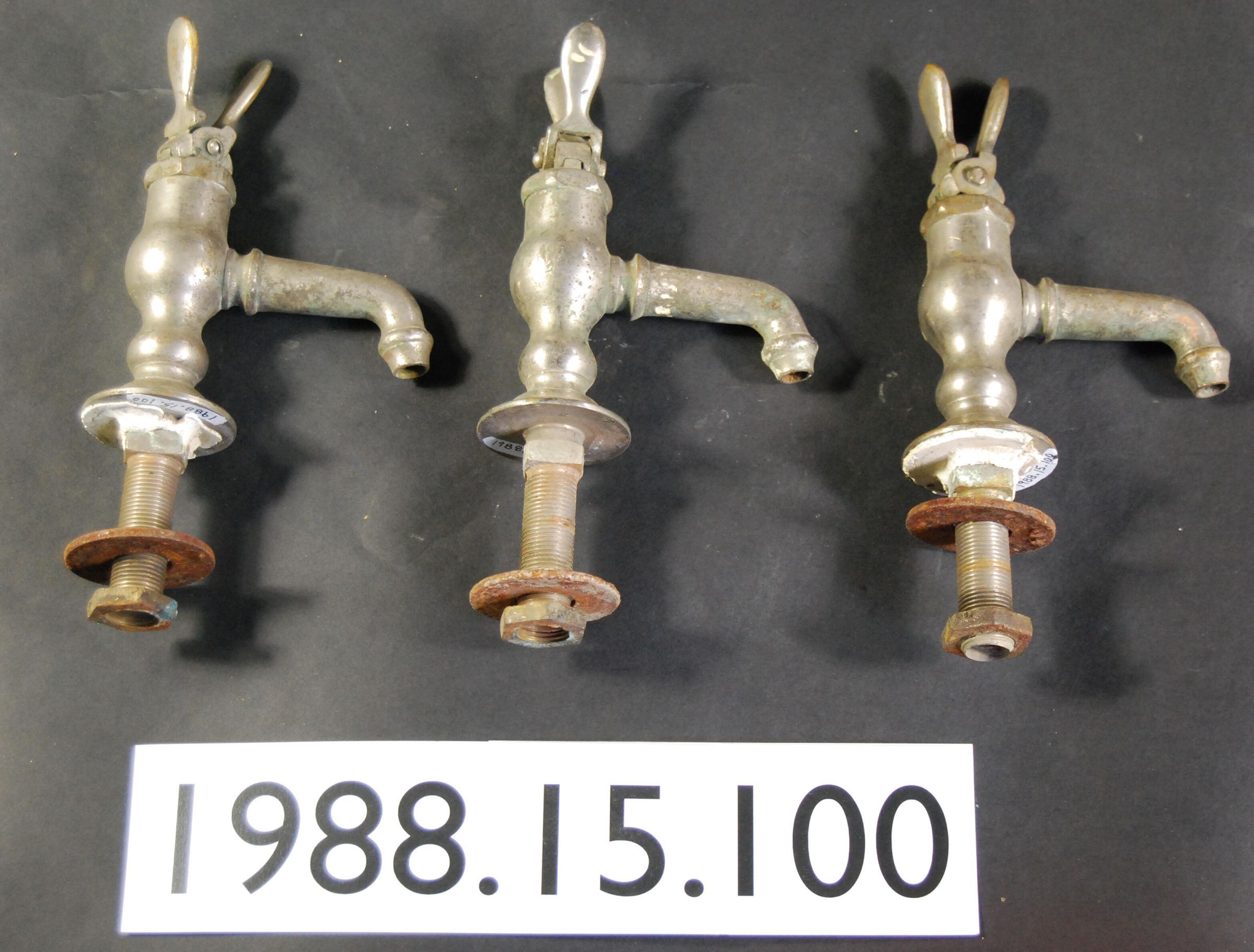 One lot of three. Nickel-plated brass sink faucets with single, spring loaded. Pinch-ears handle on each. Single spout. Horizontal mount. Possibly from commercial bath sink.