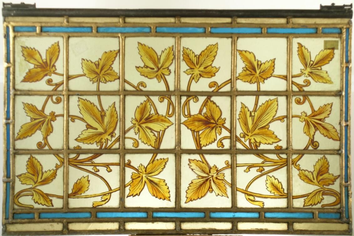 Window, leaded casement. One of a pair, 1988.1.204. 18 square painted and silver stained panels; painted leaves in panels.Borderd by clear and blue Cathedral glass.