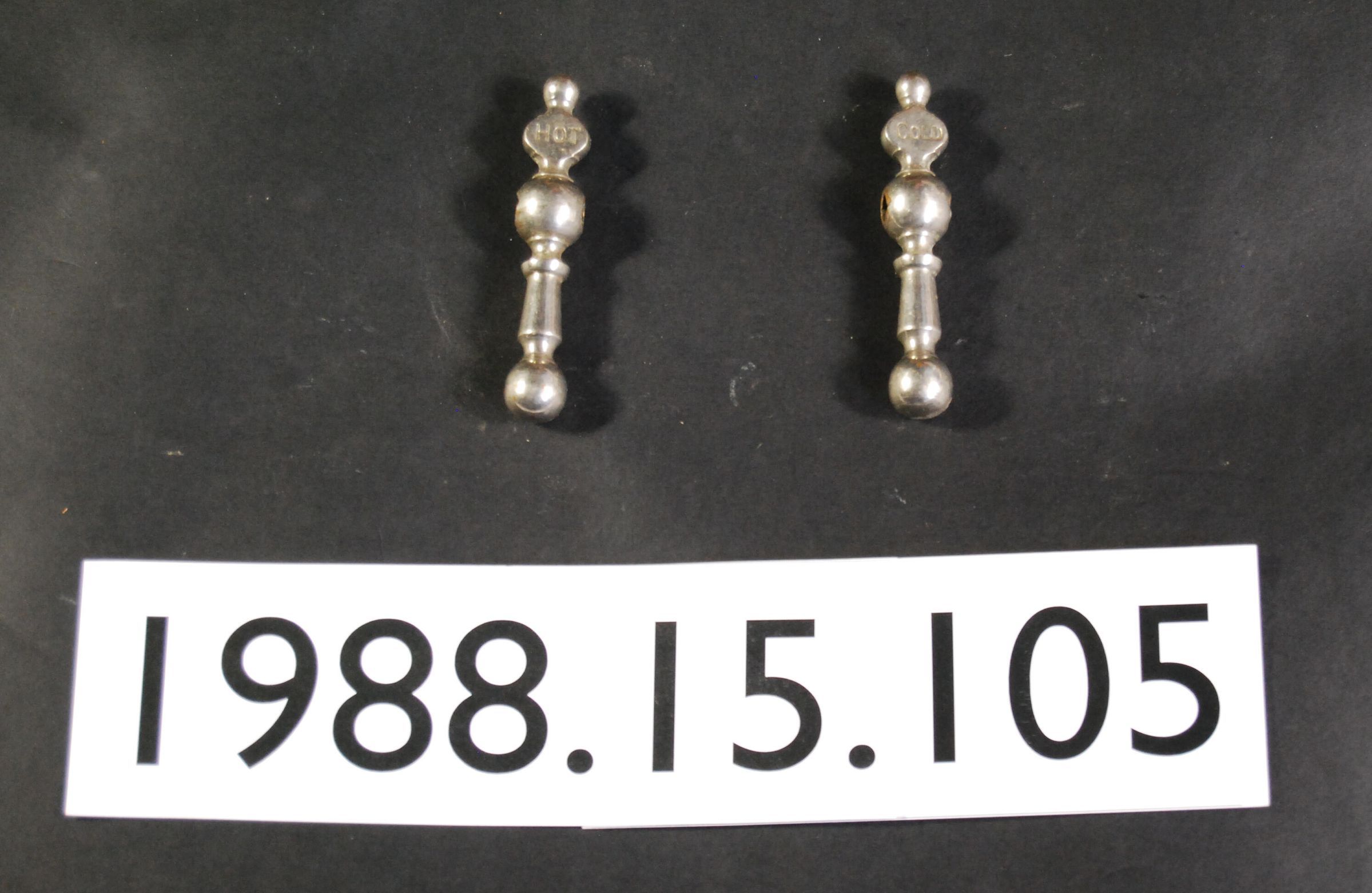 Pair on nickel-plated brass faucet tee handles with impressed "HOT" and "COLD."