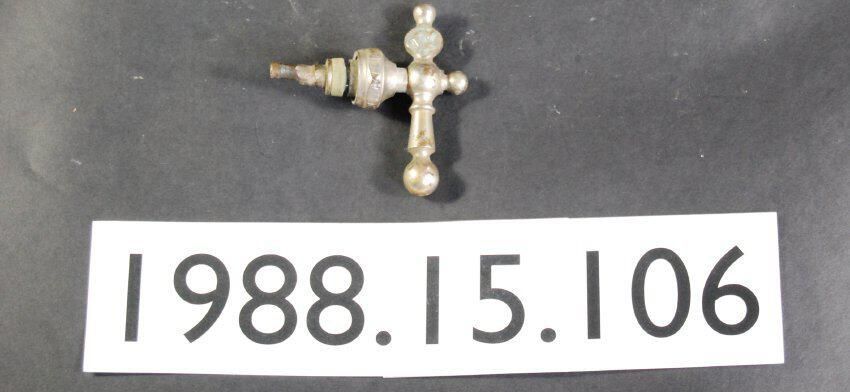 Single, nickel-plated brass faucet tee handle with impressed "HOT."