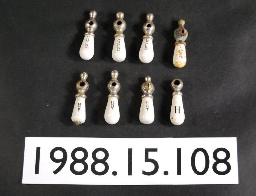 One lot of three "Cold," three "HOT," one "C," and one "H" nickel-plated brass sink faucet tee handles with vitreous ceramic marked as above stated. Some possible matching sets.