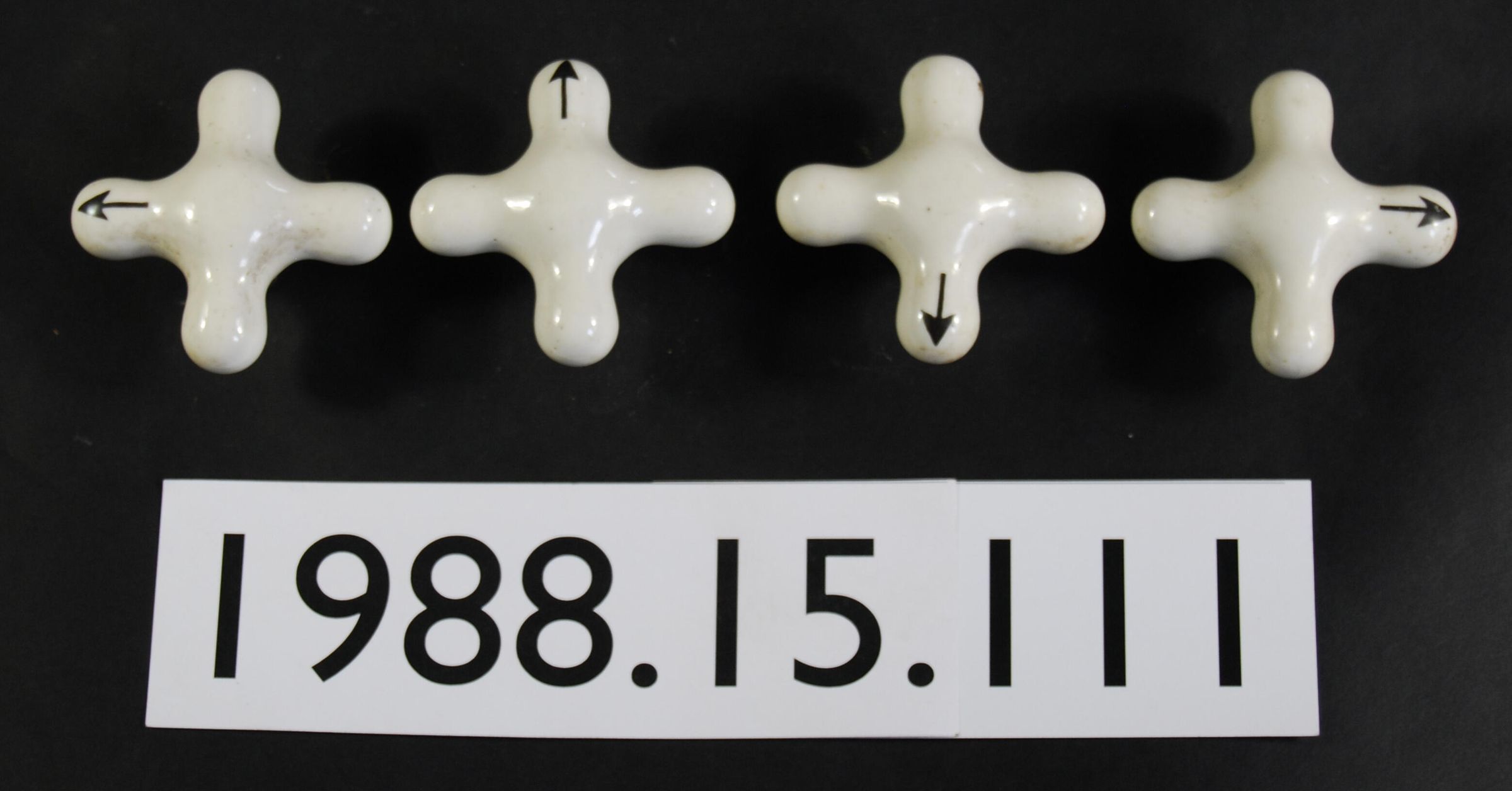 One lot of four vitreous ceramic four-arm handles. Each marked with "---------" and brass fitting. Inscriptions or Markings: Manufacturer: Place of Manufacture: Design motif: Style: Finish: Glazed