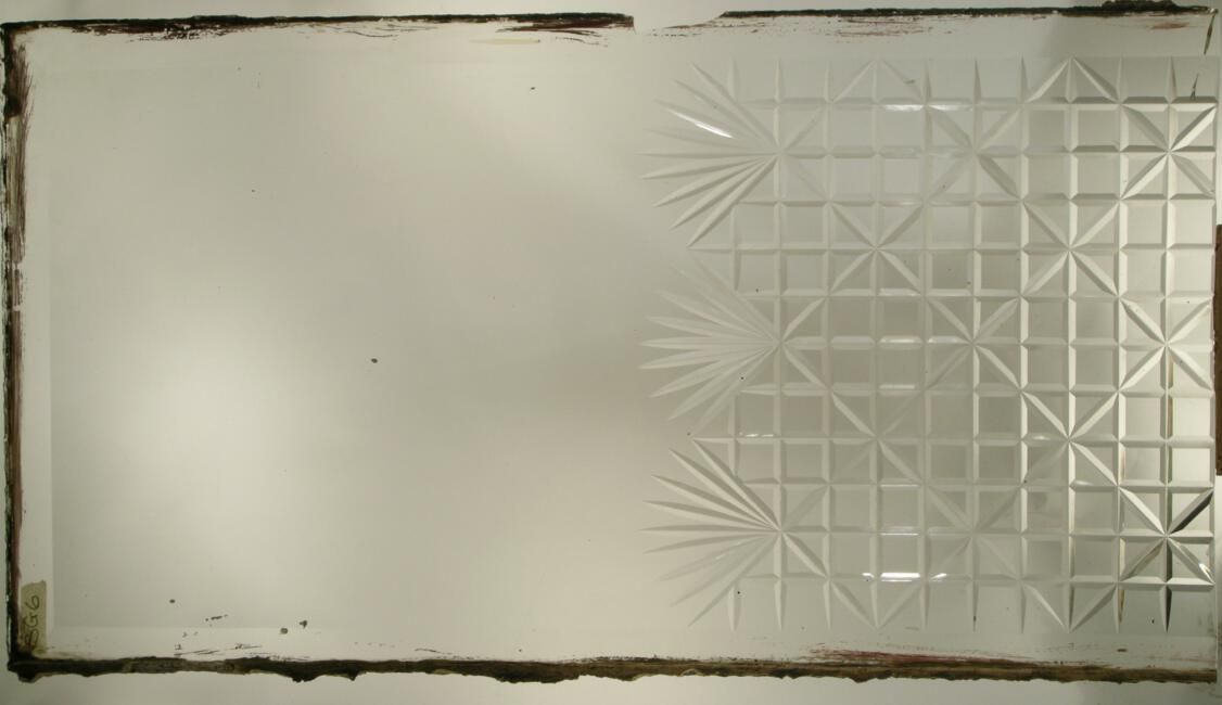 Beveled glass window wheel; etched lattice pattern. Broken in half.