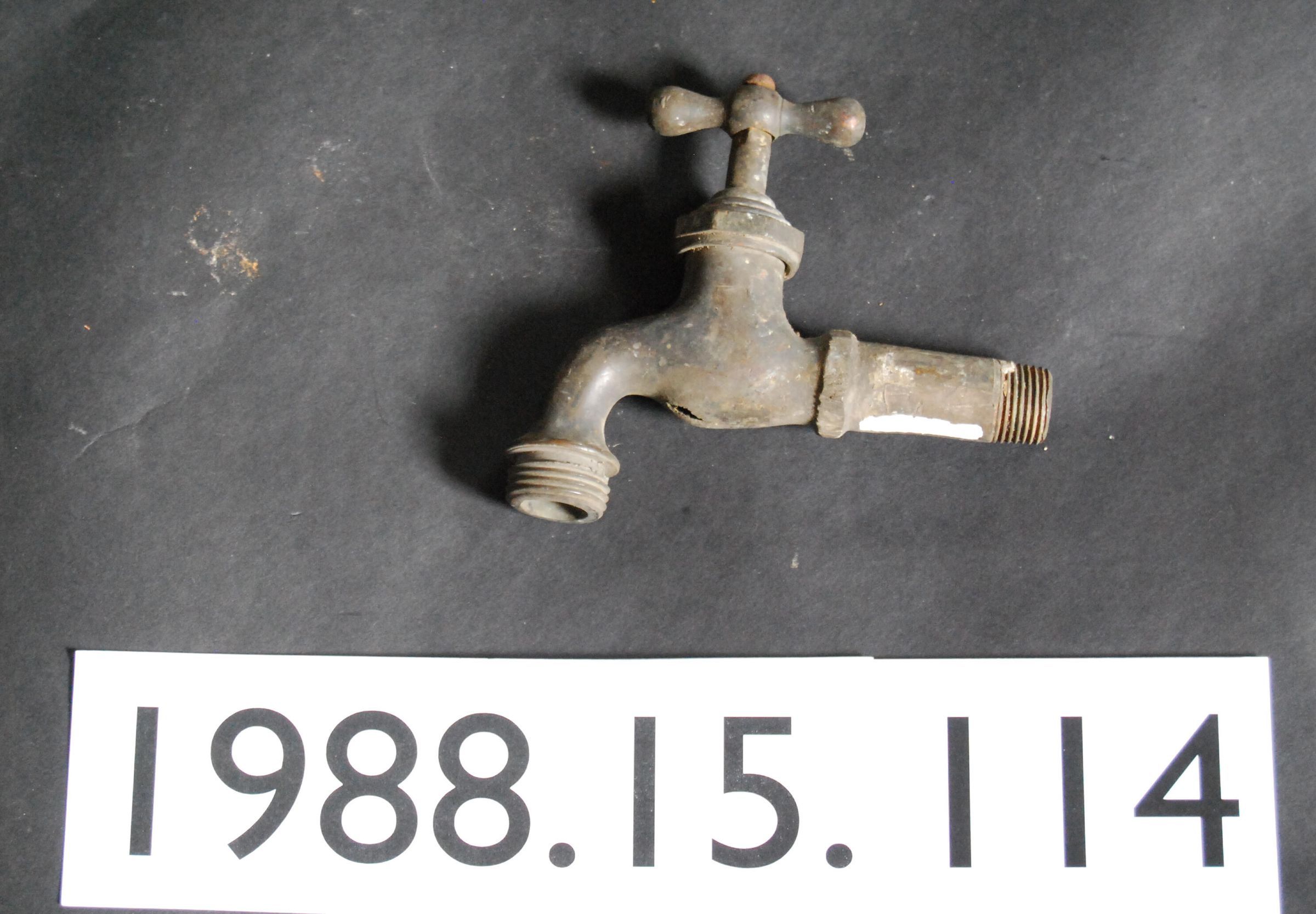 Brass faucet with threaded spout and tee handle. Body of faucet cracked by frozen water expansion -- indicative of outdoor use as hose bibb. Inscriptions or Markings: Manufacturer: Place of Manufacture: Design motif: Style: Finish: None