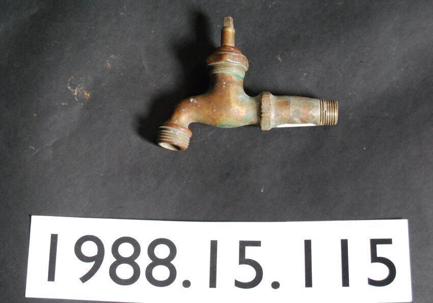 Brass faucet with threaded spout. Remnants of nickel-plating. Missing handle. Body of faucet cracked by frozen water expansion - indicative of outdoor use as hose bibb. Impressed mark: "STERLING."