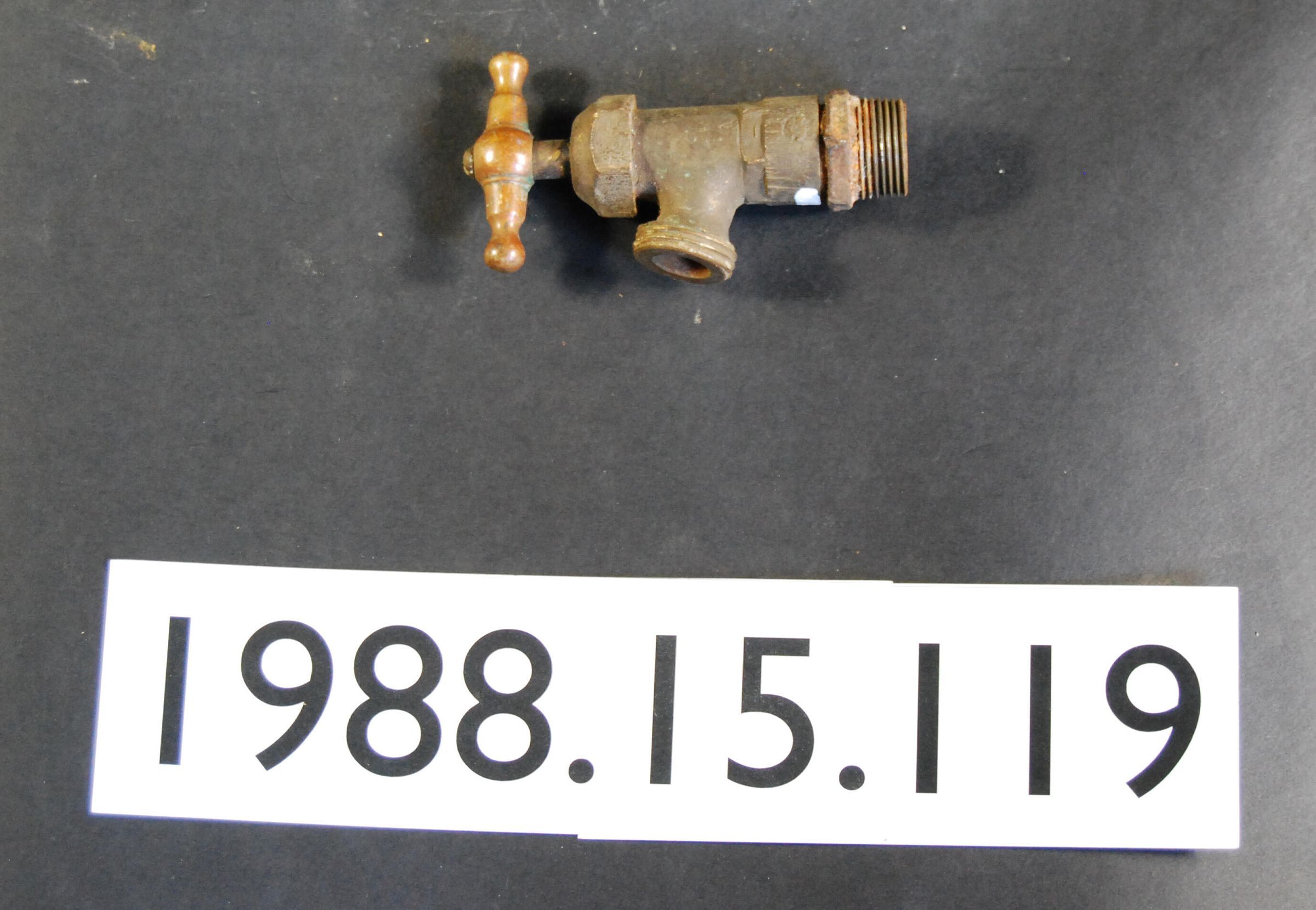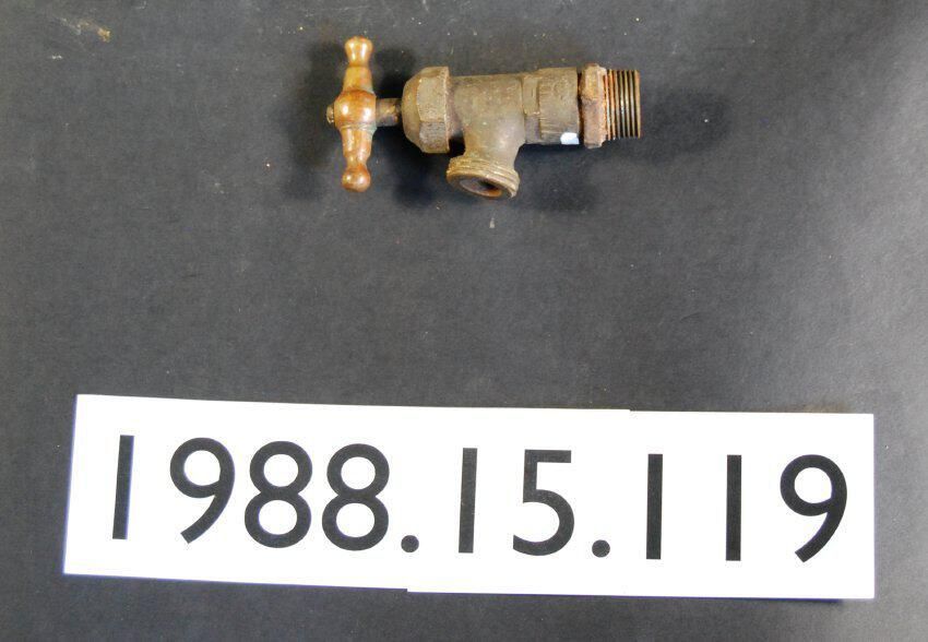Brass faucet with threaded spout and "T" handle attach iron fitting. Inscriptions or Markings: Manufacturer: Place of Manufacture: Design motif: Style: Finish: None