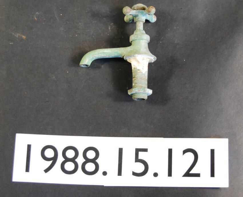 Single, nickel-plated brass sink faucet with single four-arm handle with vitreous ceramic button marked "C" and curved spout. Impressed manufacturer's mark: "STANDARD."